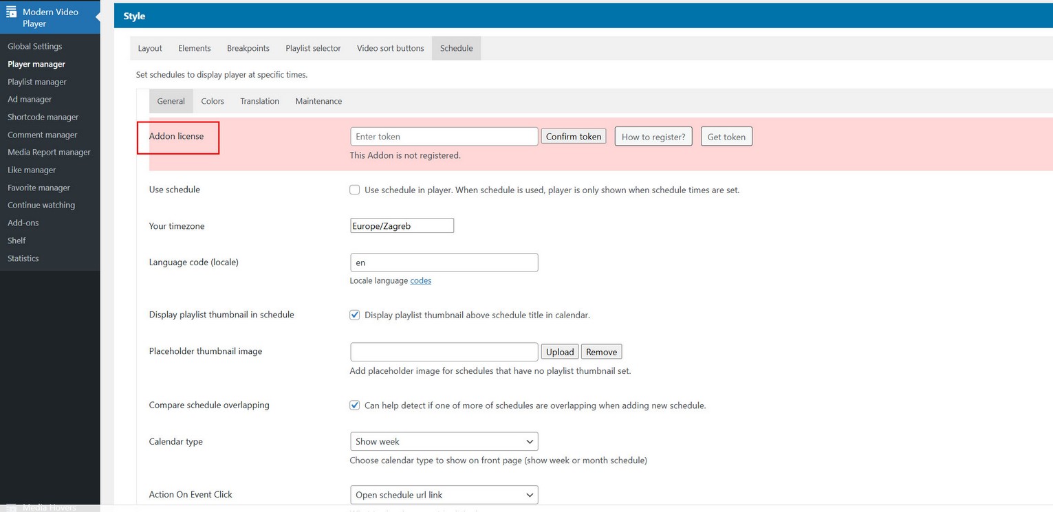 Access schedule settings in Player Manager / Edit Player / Style / Schedule tab. Most important settings include setting your timezone and locale language (your region language).