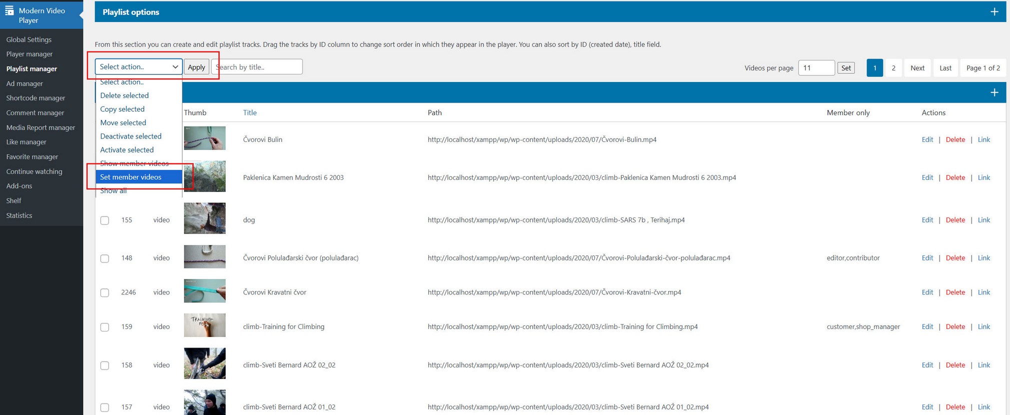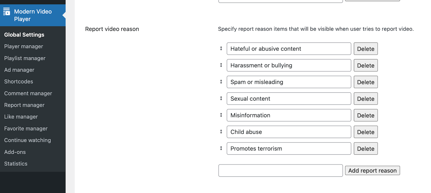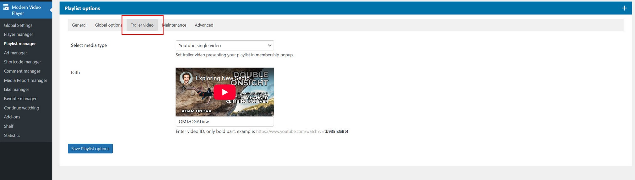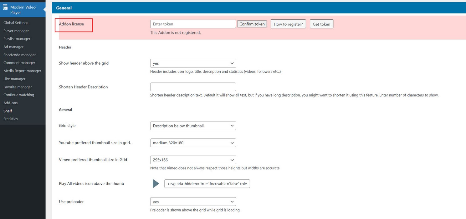 Access Shelf settings in plugin menu Modern Video Player / Shelf.