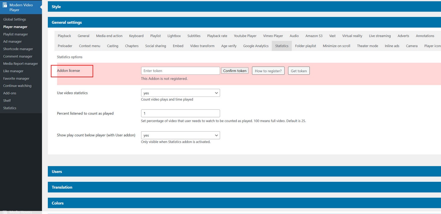Register plugin inside Player manager / Edit Player / General / Statistics tab