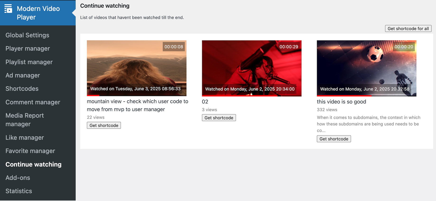 ID - media ID Type - video type Thumb - video thumbnail url Title - video title Url - video url Plays - video plays (how many times video has started). Note this is different from video finish. Total watch time - total number of seconds played Total finishes - total number video was watched till the end (this does not mean whole video was watched, just the video ended) Video duration - video duration in seconds Average engagement - Total watch time / (Total finishes * Video duration) Heatmap - heatmap data for every second of the video. On the beggining (if no data was collected), heatmap data is zero for every video second of the video. Later it increases as each part of the video has been watched repeated number of times. The higher the number, the more this part (or second) of the video has been watched.