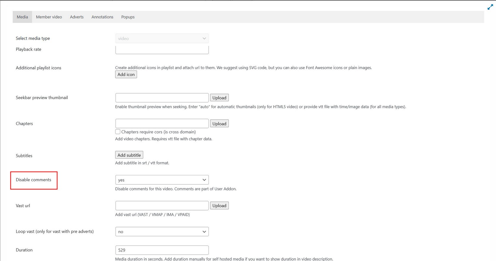 Disable comments in Playlist manager / Add media dialog: