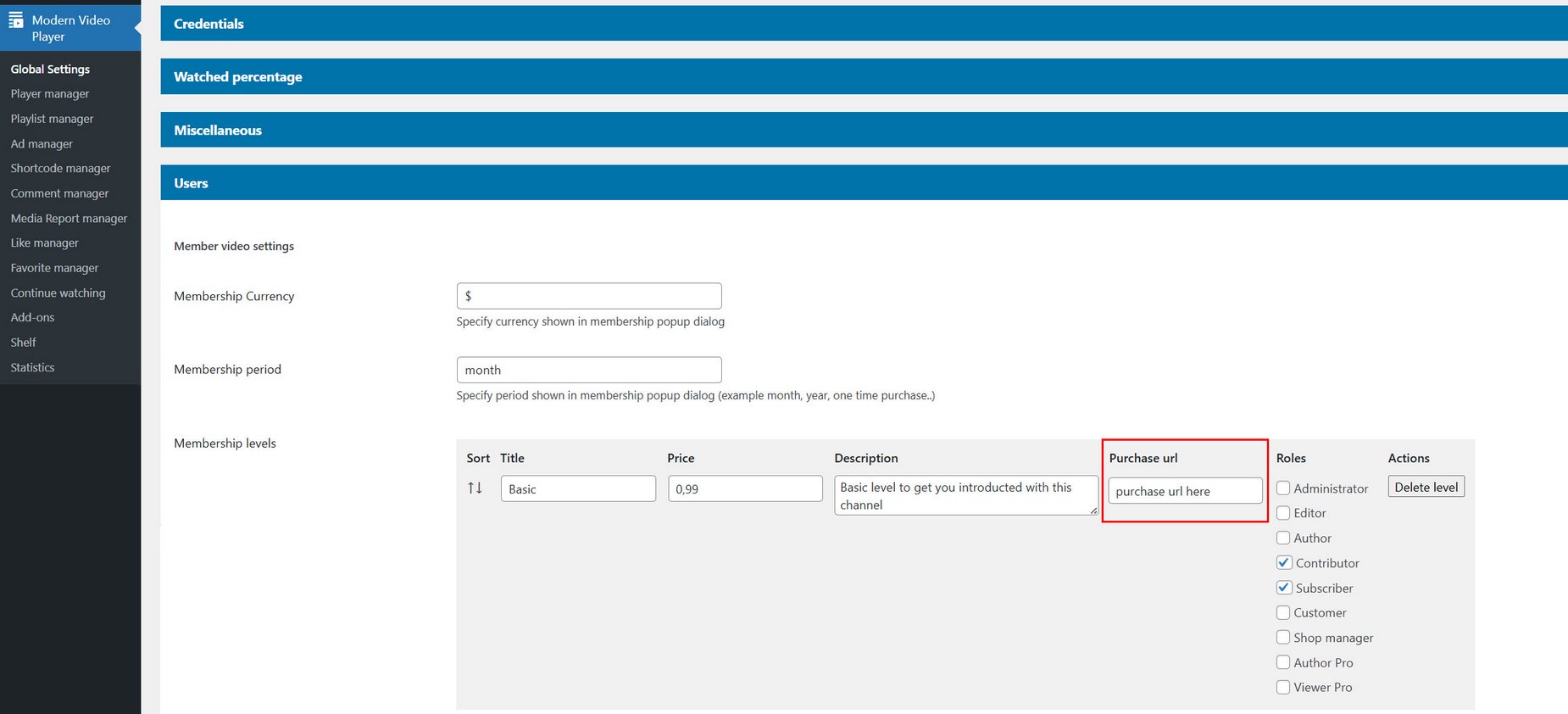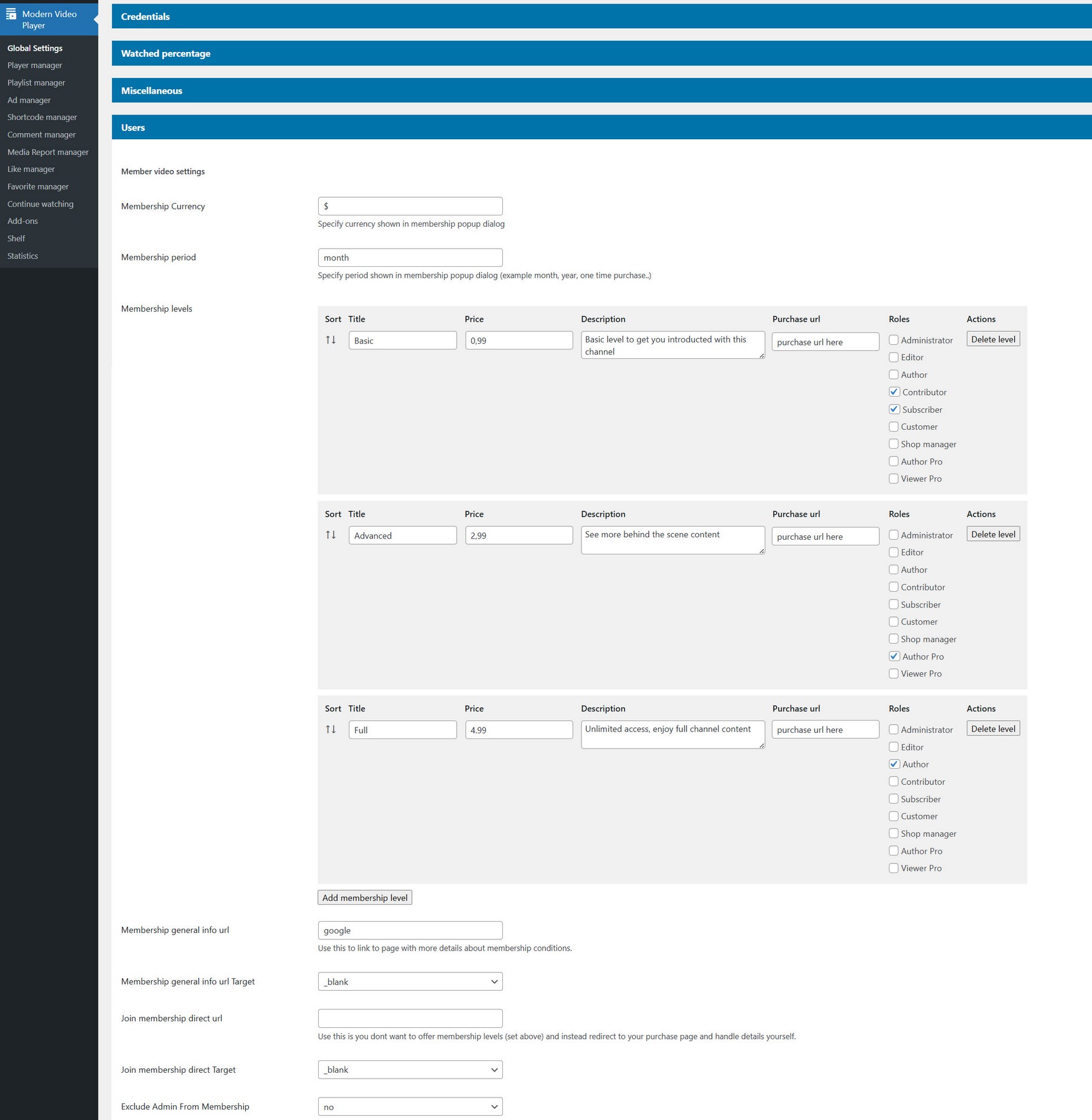 Set Youtube or Vimeo credentails in Modern video player Plugin menu / Global settings: