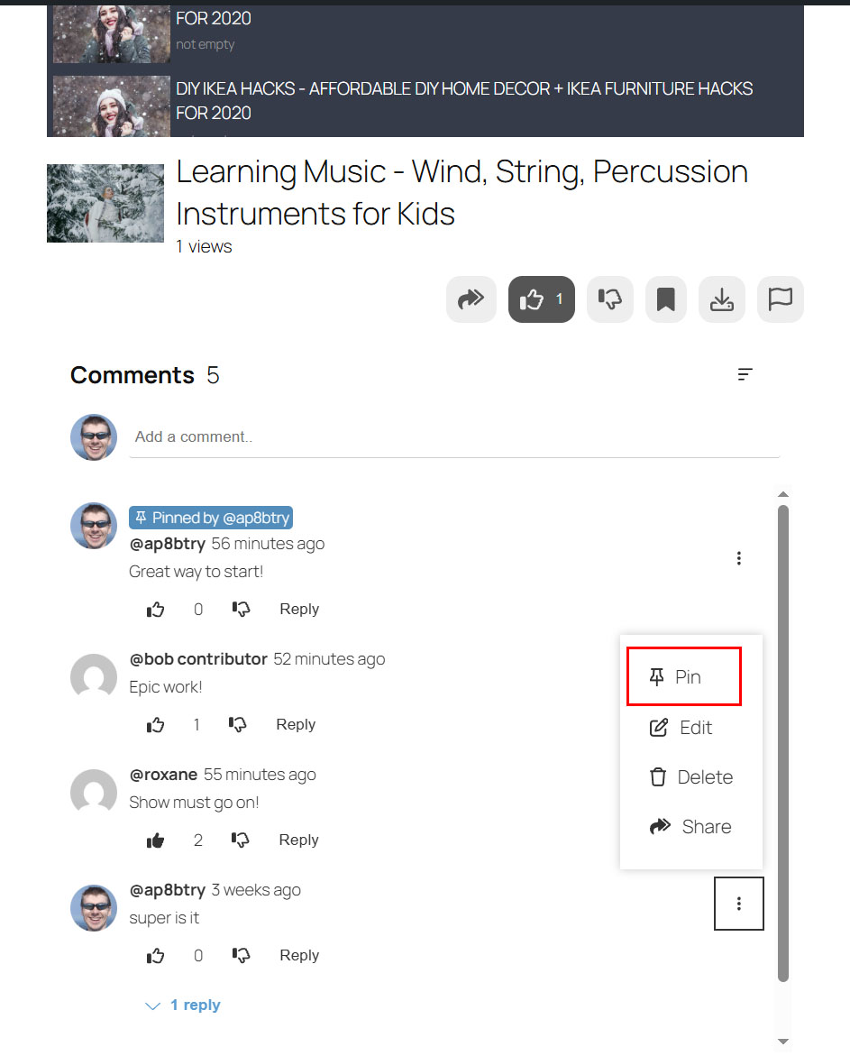 Comments can be pinned to top to make them more visible to audience.