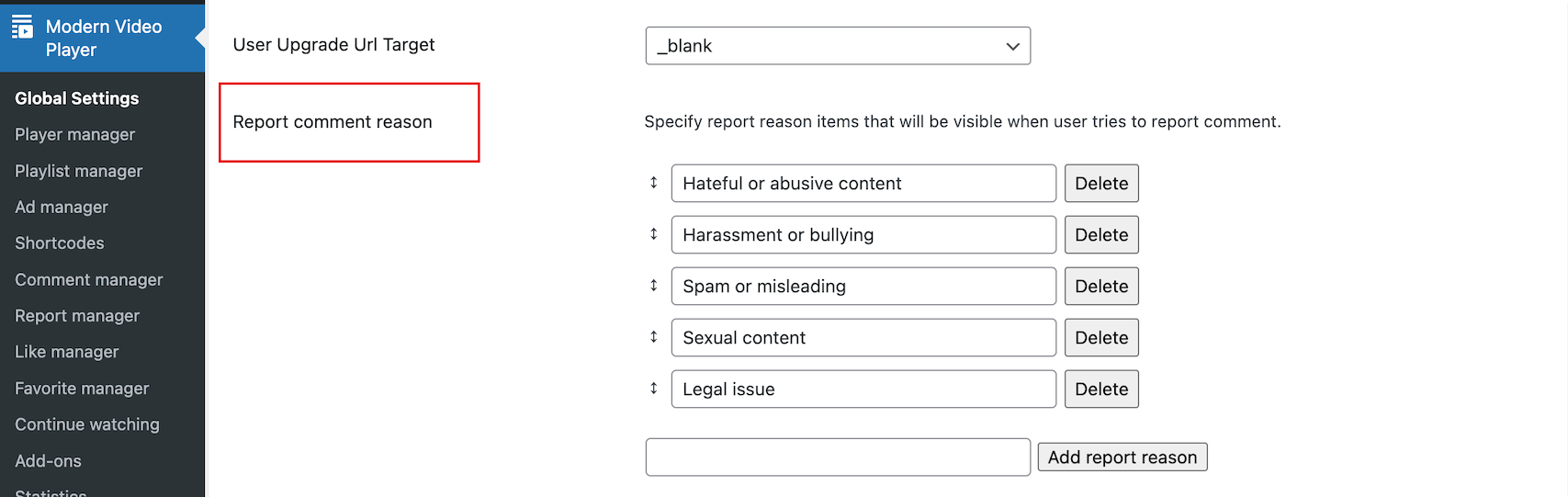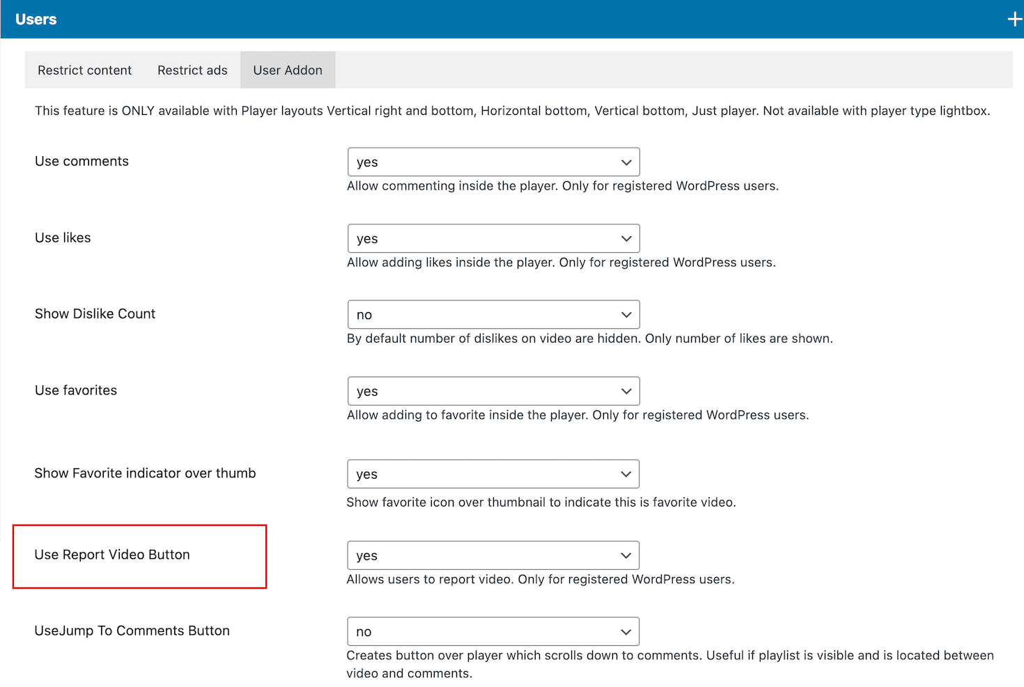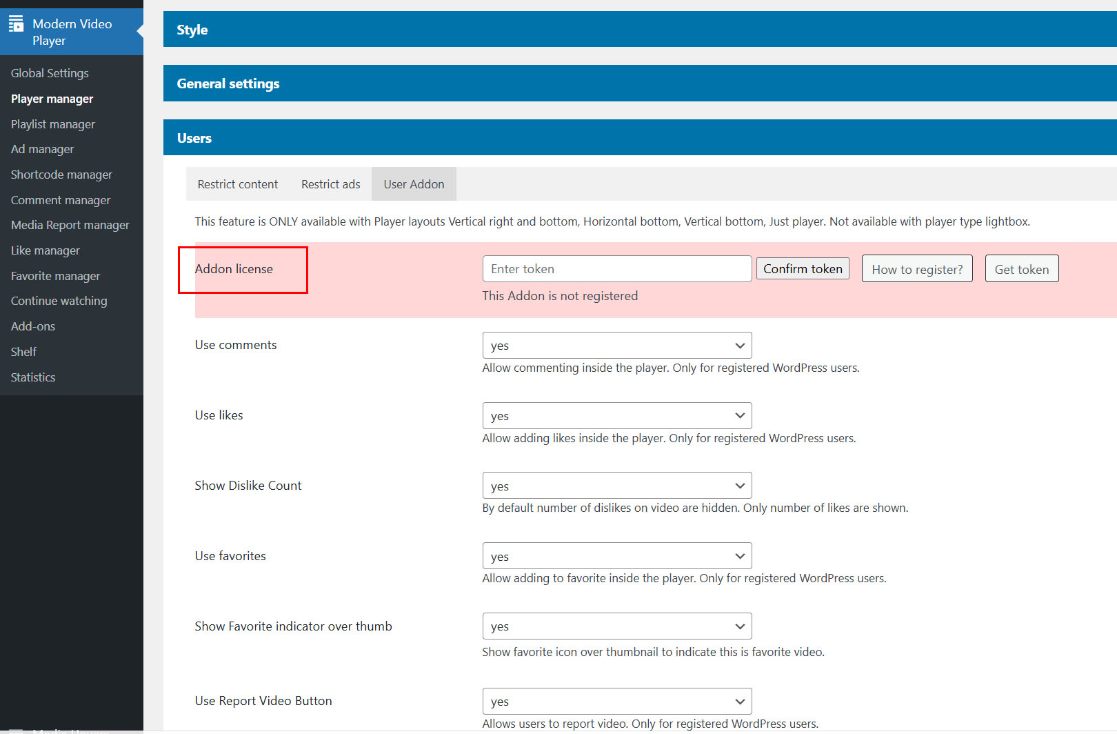 Access comments settings in Player manager / Edit player / User Addon tab