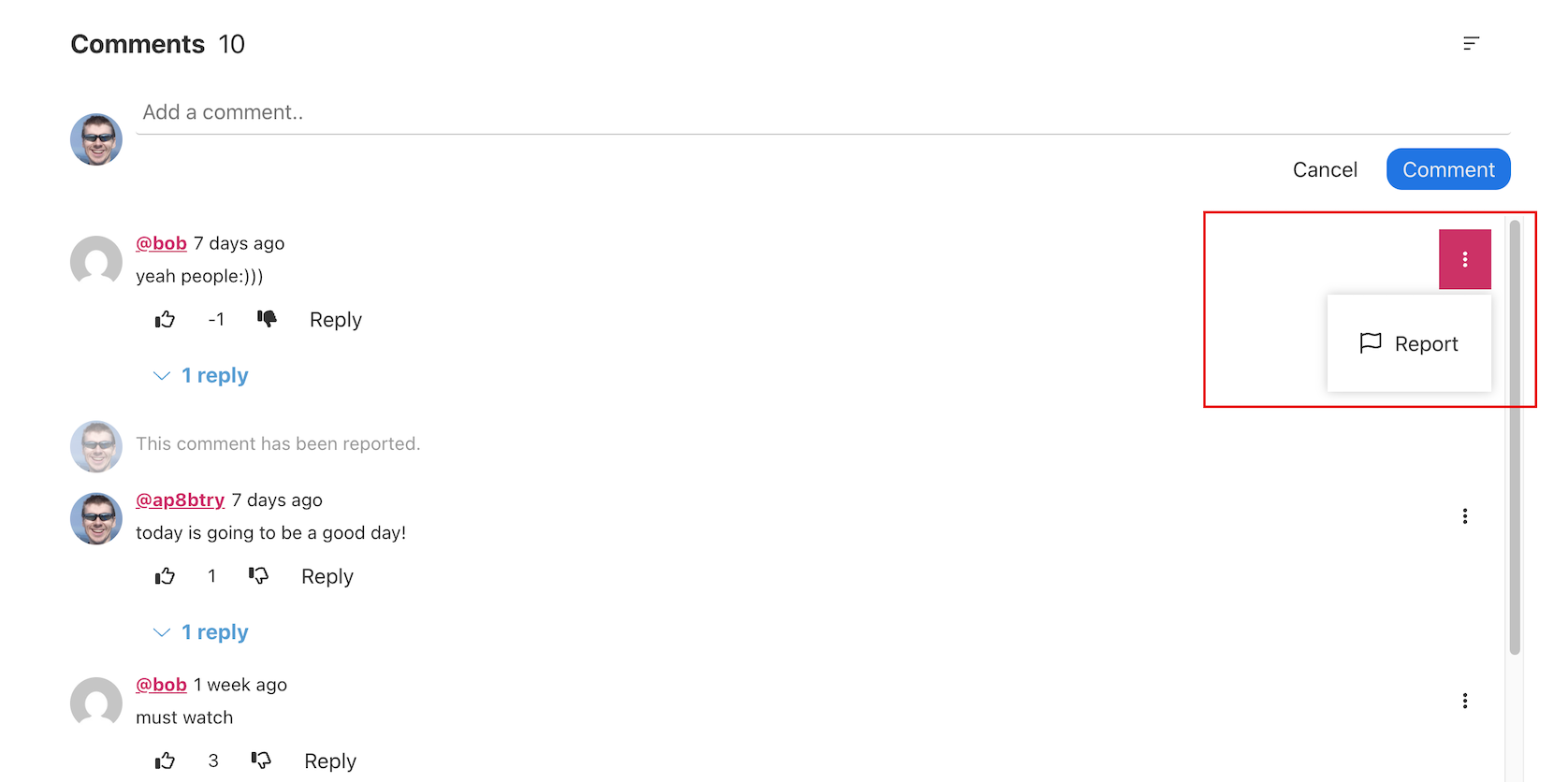 Comment can be reported using menu on the right side of the comment.