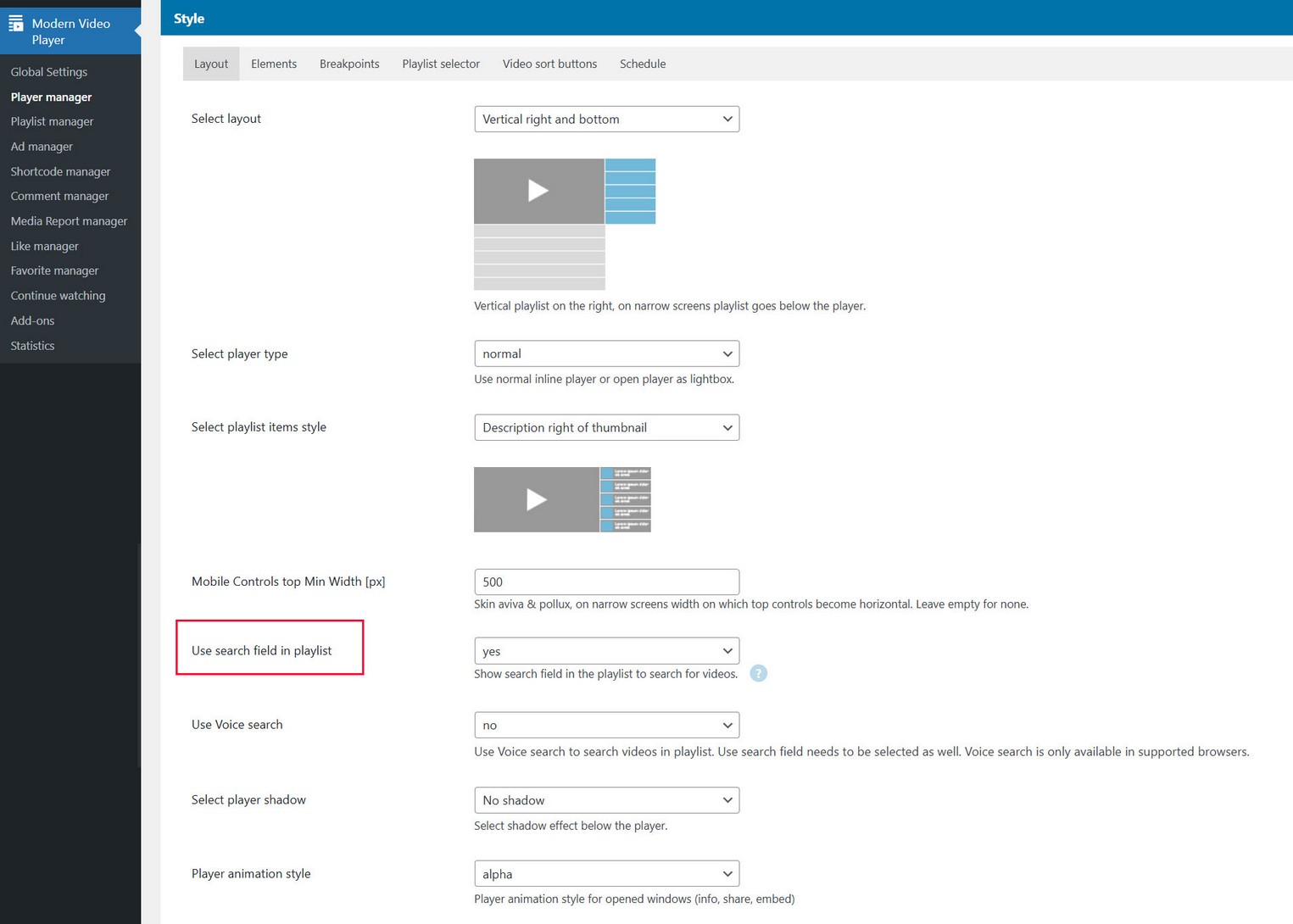 - Supported layouts for lightbox player are Vertical right and bottom, Horizontal bottom, Vertial bottom, No playlist (use just player).