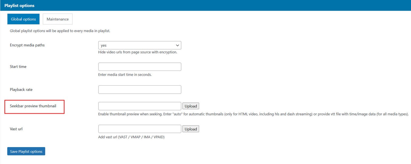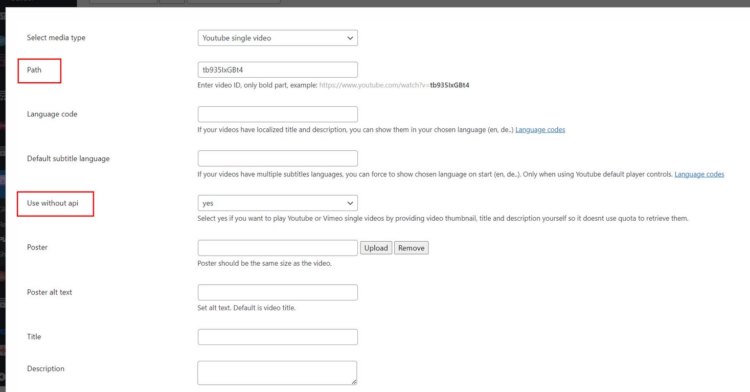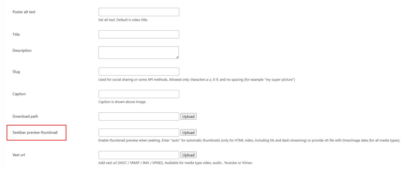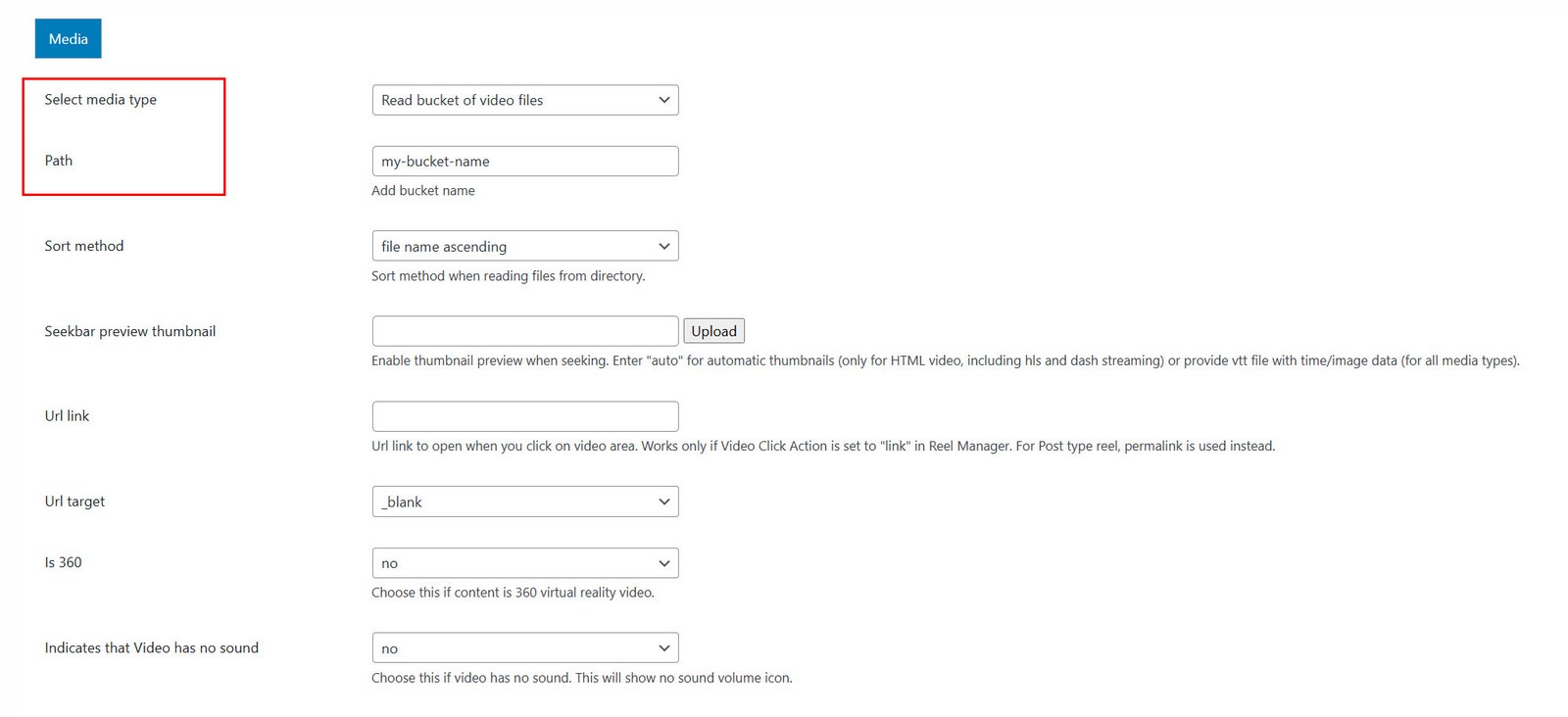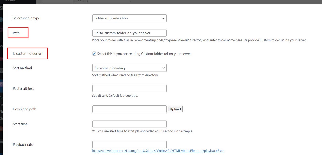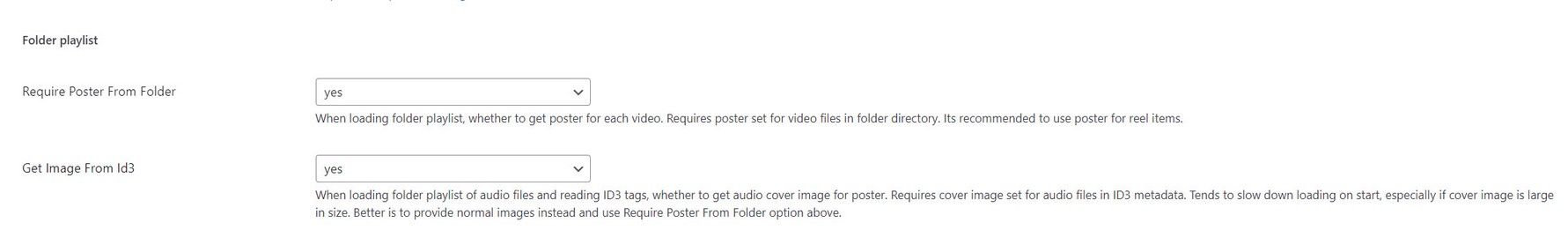 requirePosterFromFolder - true / false. When loading folder playlist, whether to get poster for each video. Requires poster image files present in folder directory for each video. Its recommended to use poster for reel items. getImageFromId3 - true / false. When loading folder playlist of audio files and reading ID3 tags, whether to get audio cover image for poster. Requires cover image set for audio files in ID3 metadata. Tends to slow down loading on start, especially if cover image is large in size. Better is to provide normal images instead and use Require Poster From Folder option above.