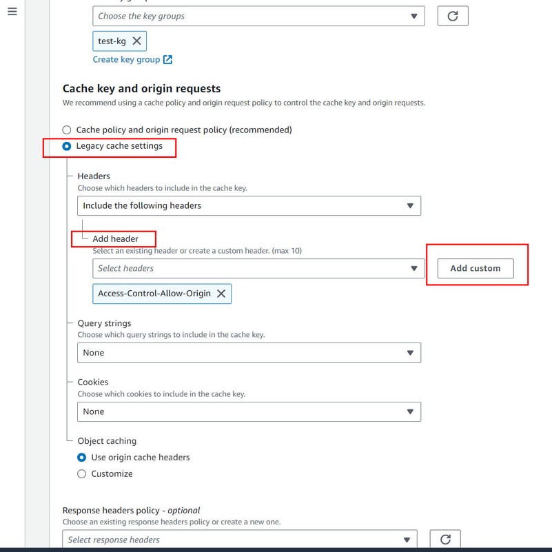 Under Cache key and origin requests select Legacy cache settings, choose Include the following headers, click Add custom button, and paste this as custom header inside: Access-Control-Allow-Origin