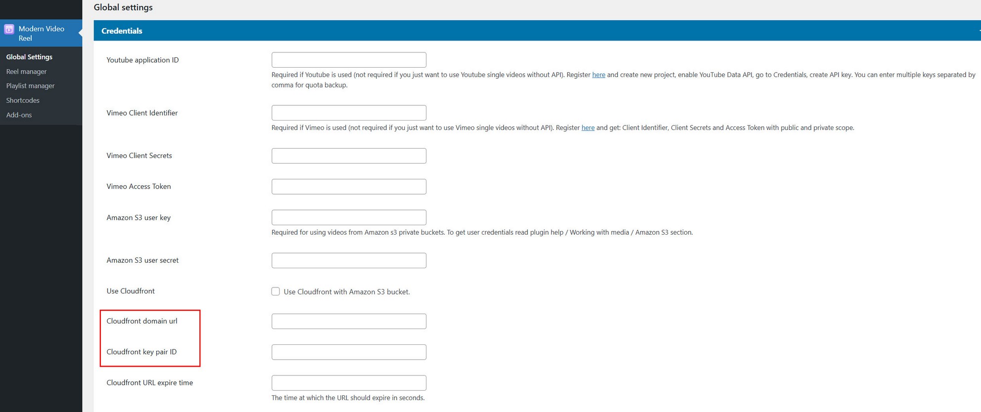 Copy distribution domain name as Cloudfront domain url and Public key pair ID into credentials, and set Use Cloudfront option:
