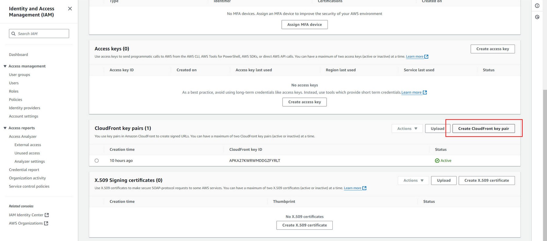 Copy distribution domain name and Public key pair ID into credentials, and set Use Cloudfront option: