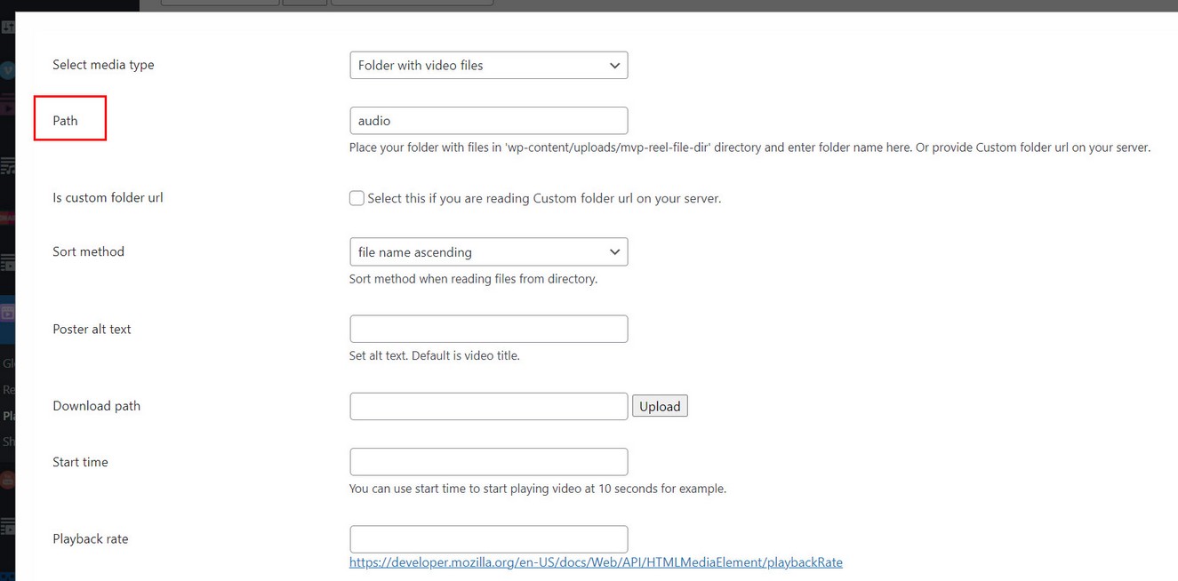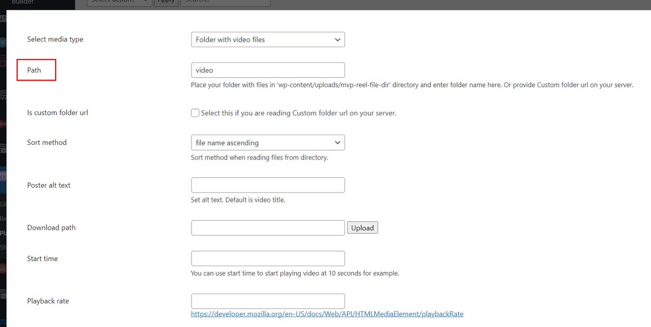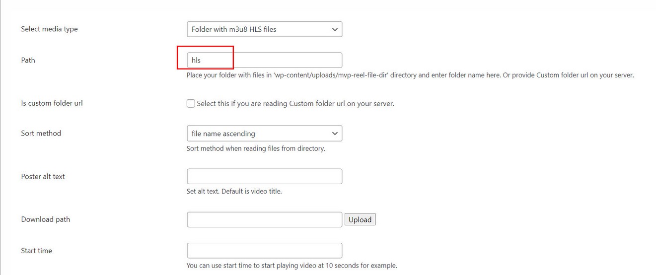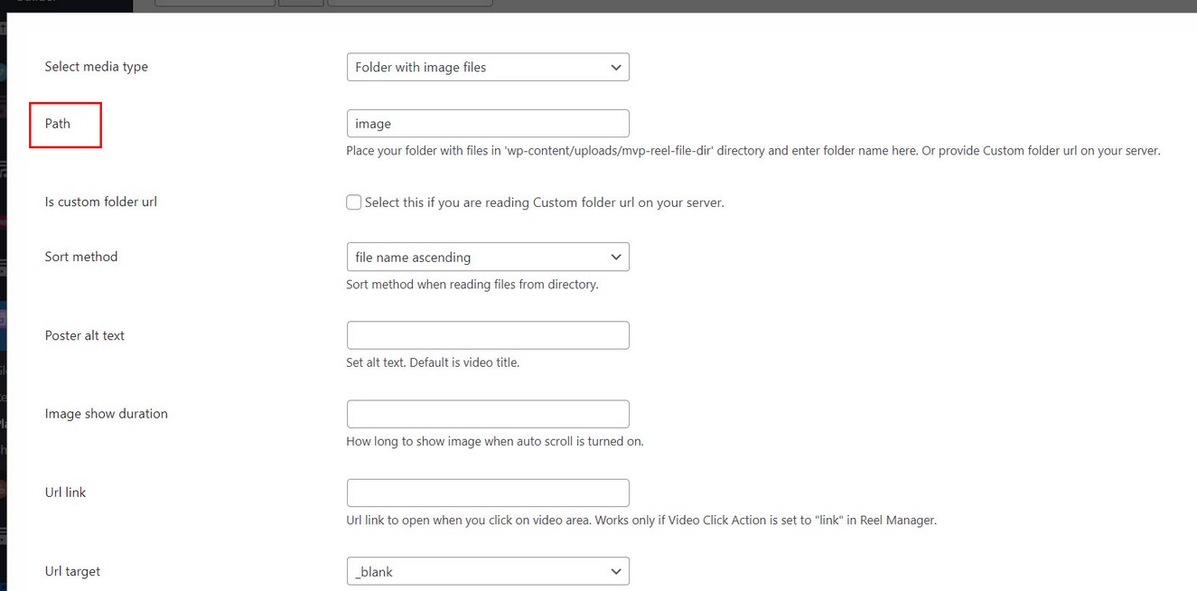 Place folder in wp-content/uploads/mvp-reel-file-dir directory and enter folder name in field: