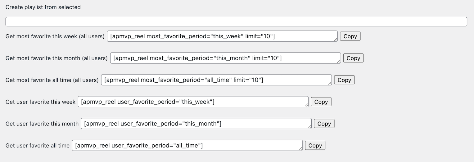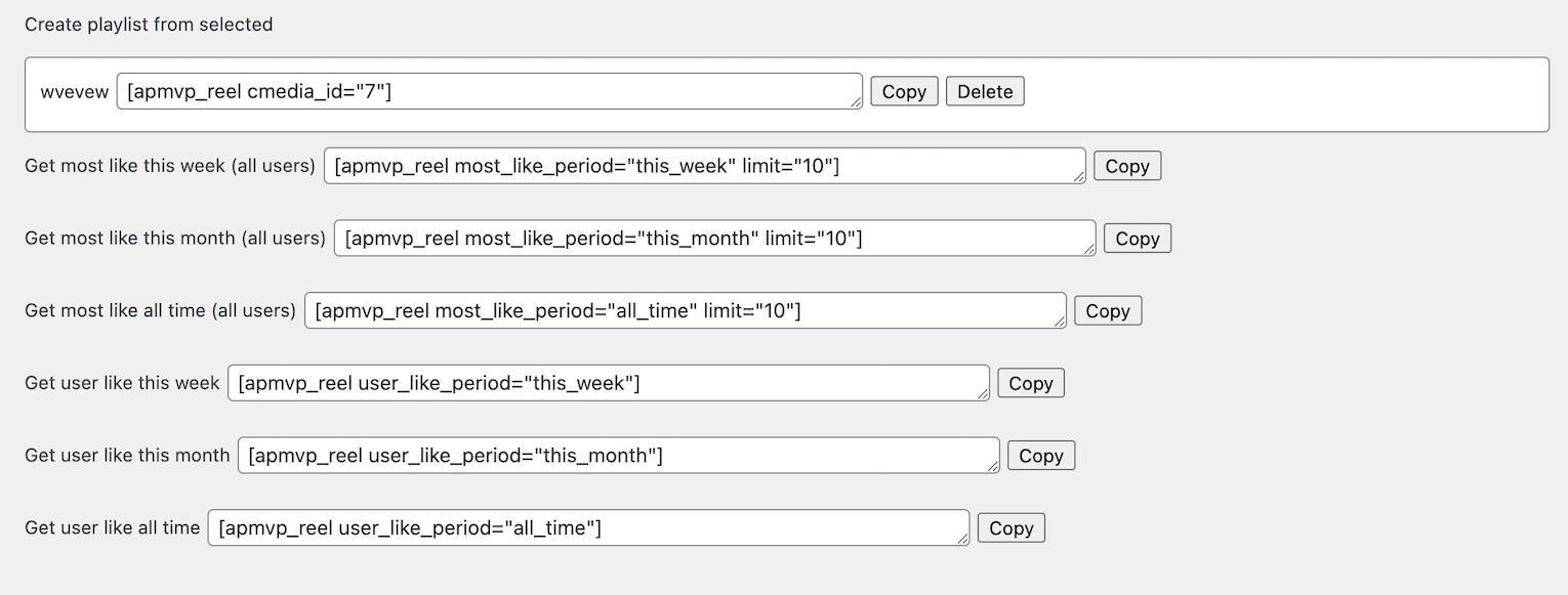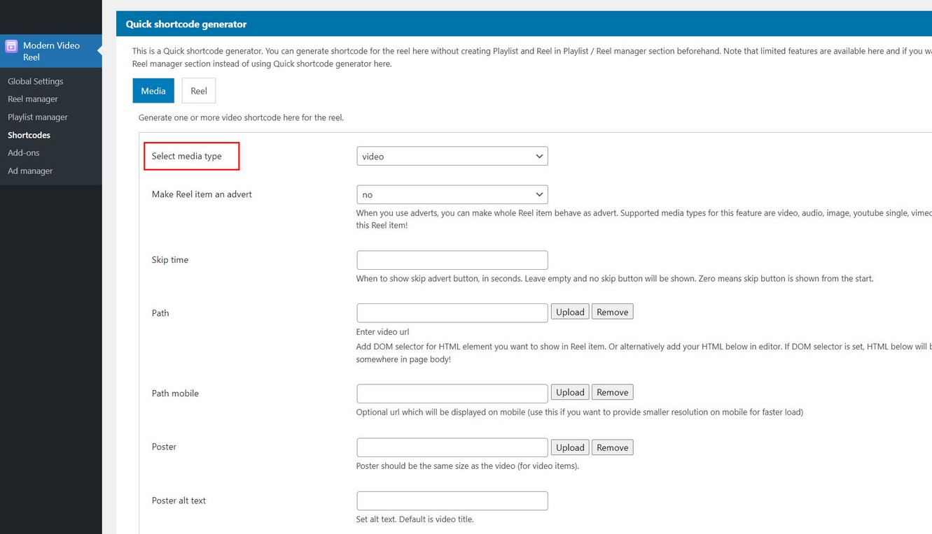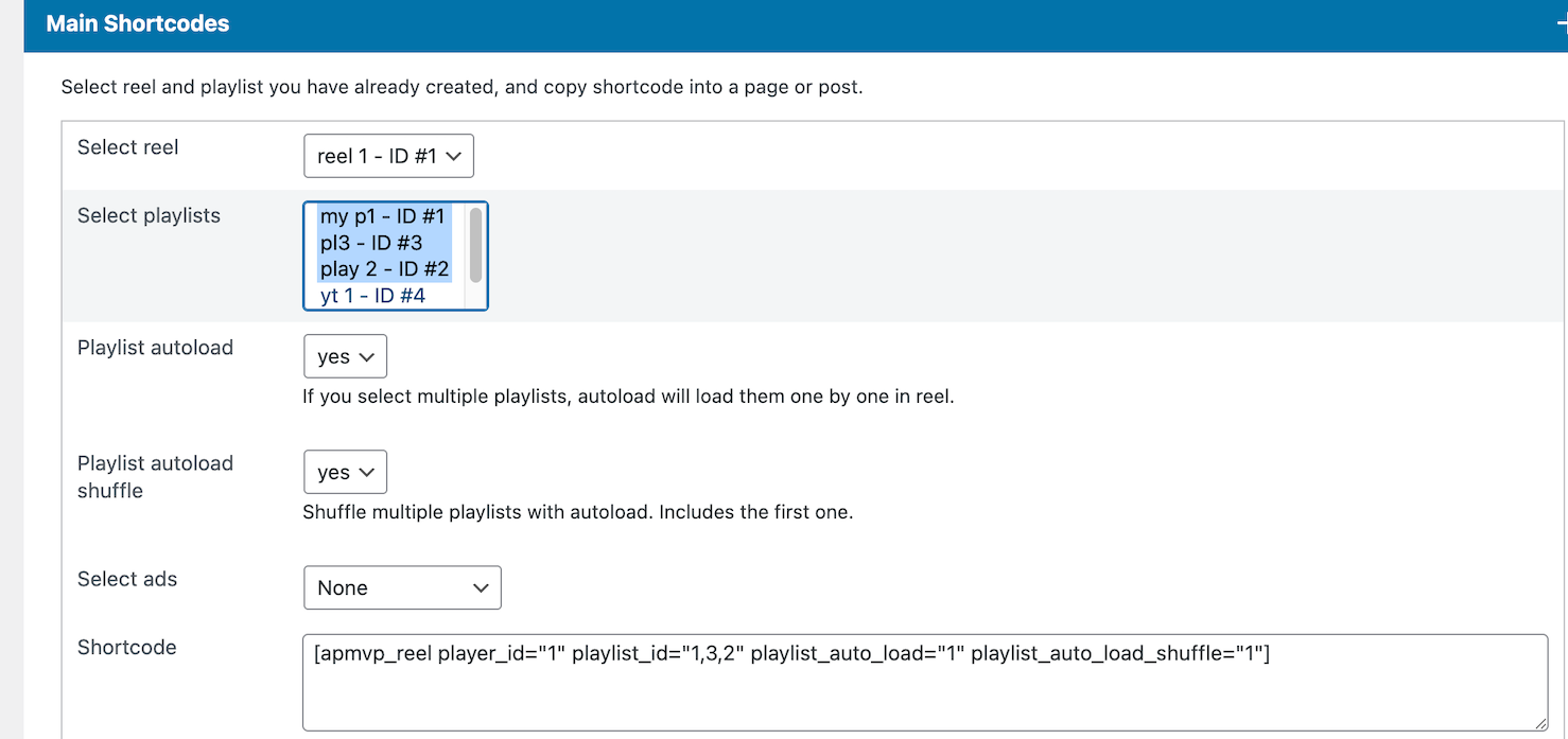 Once you have created new Reel and playlist, Go to Shortcodes plugin menu and get shortcode (choose reel and playlist for your shortcode):