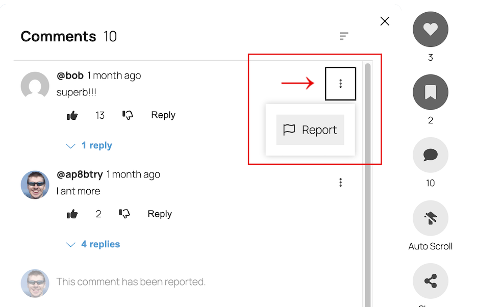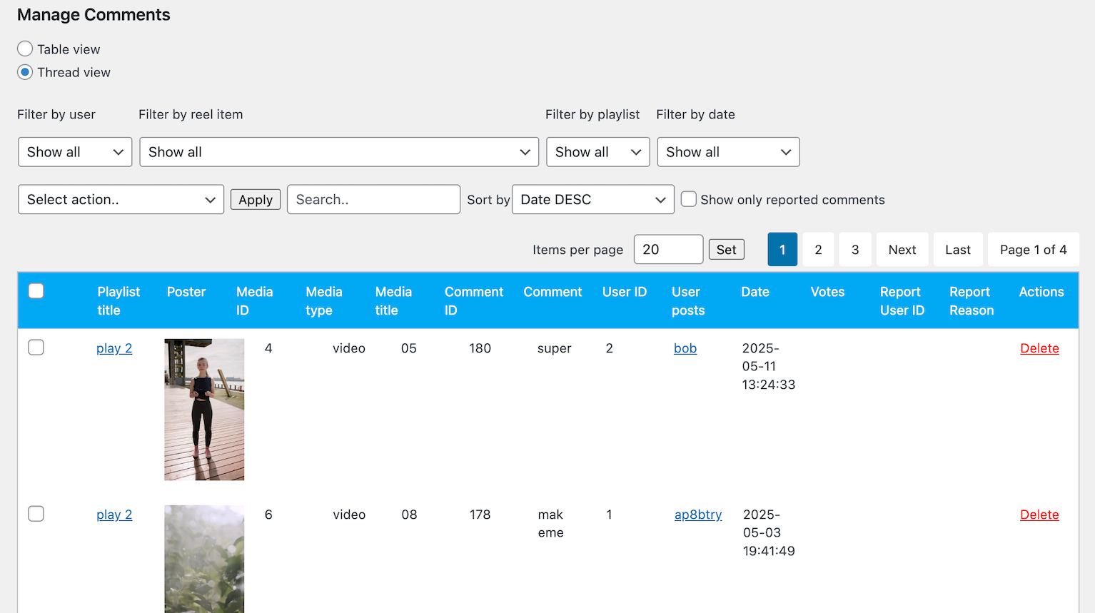 Comments can be reported (by registered WordPress users). Admin has its own menu in the plugin where he can see and manage all comments.