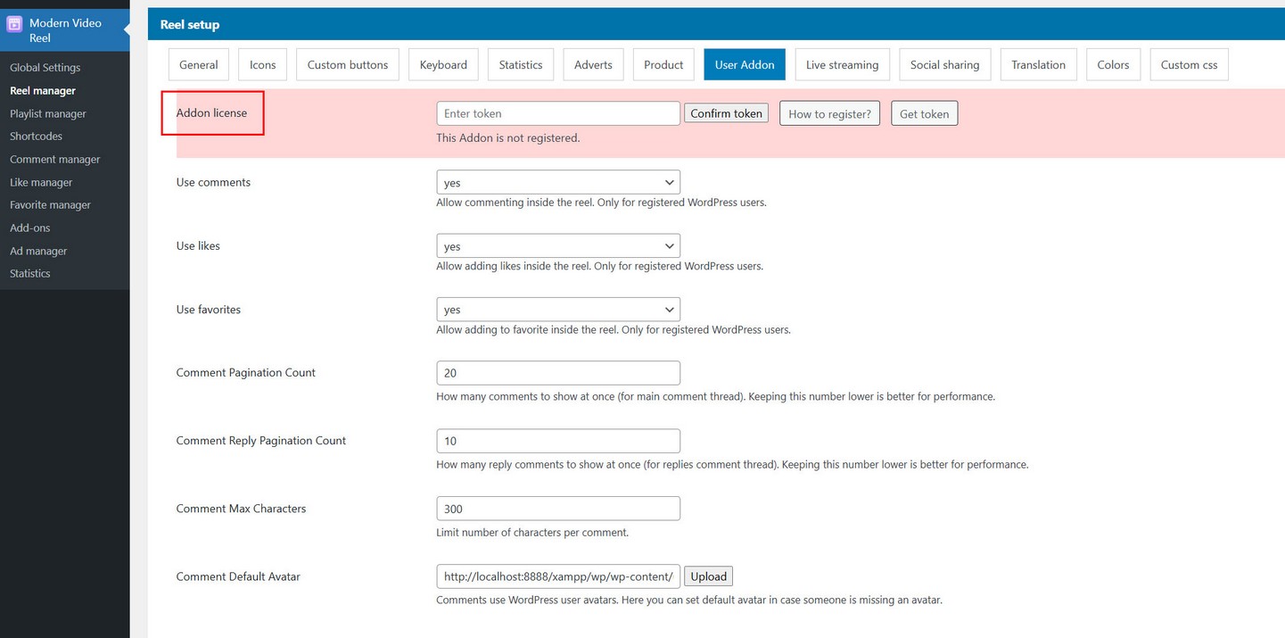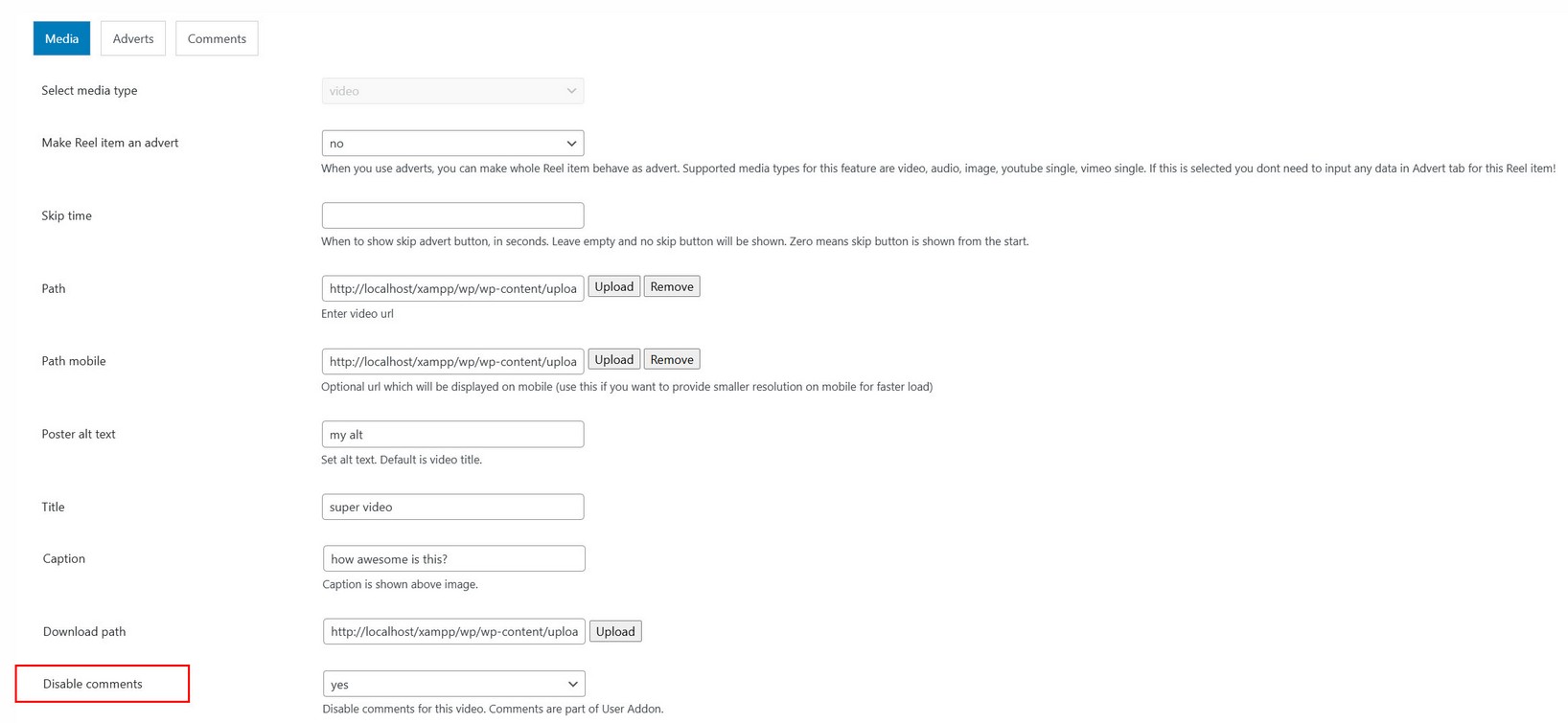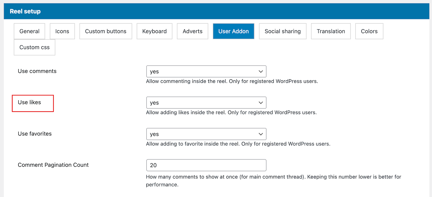 Enable comments inside Reel manager / Edit Reel / User Addon tab