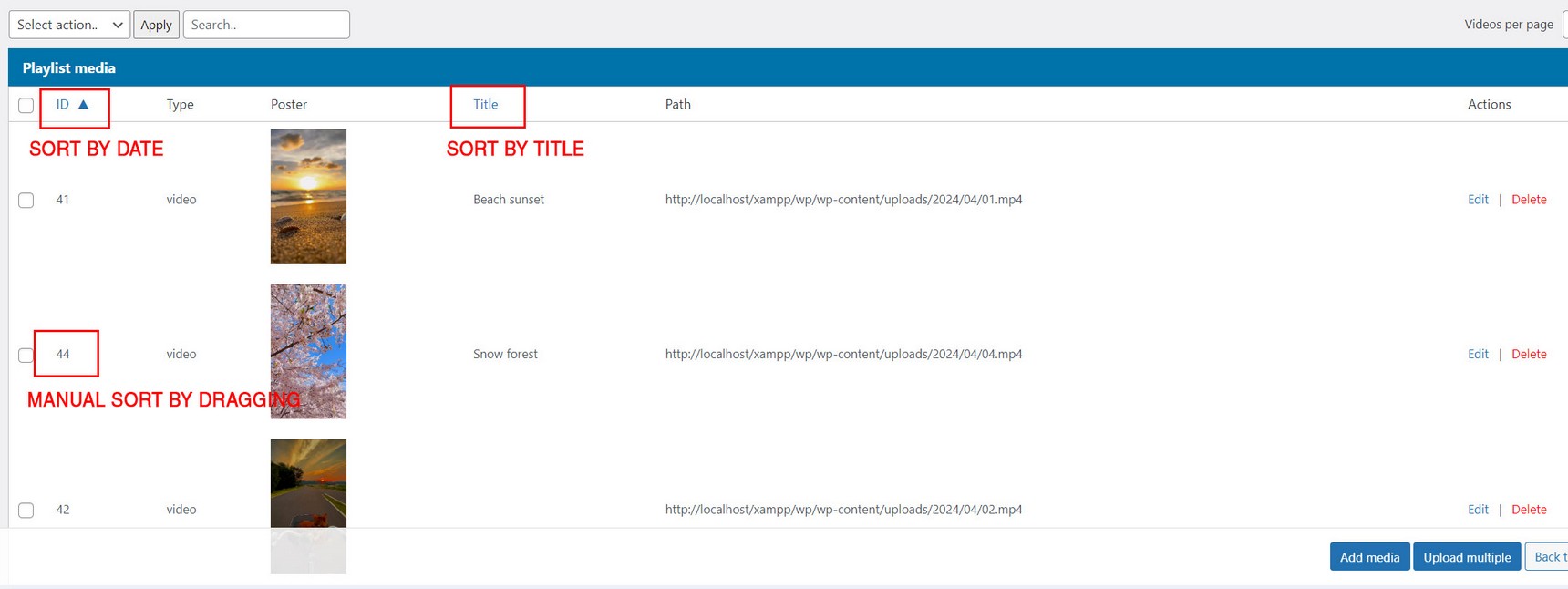You can upload folder of videos (audio or images) located in WordPress uploads directory or folder on some custom location your server.