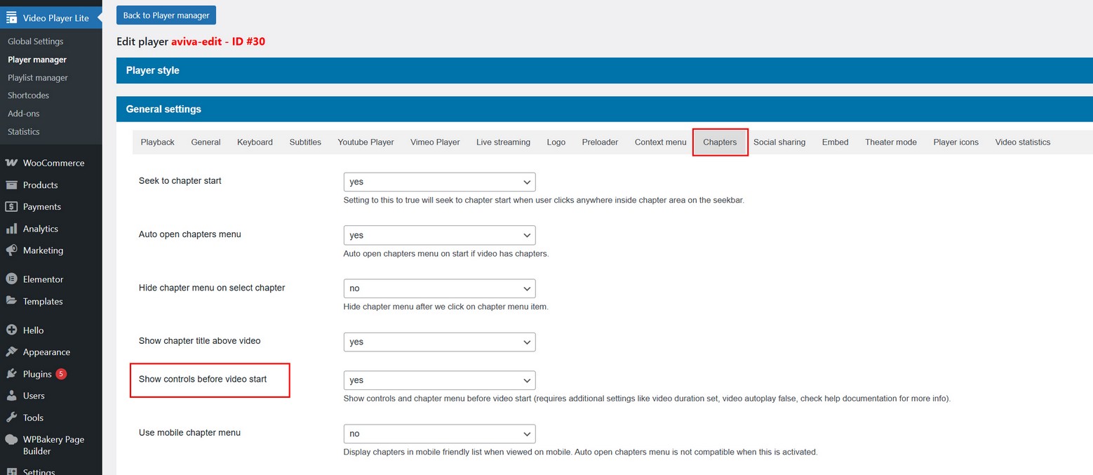 1. If you want to show player controls menu before video starts, select Show controls before video is played in Edit Player / General settings / General tab.