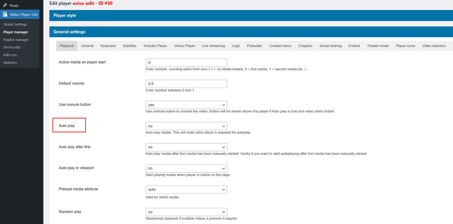 2. Set video auto play false in Edit Player / General settings / Playback tab.