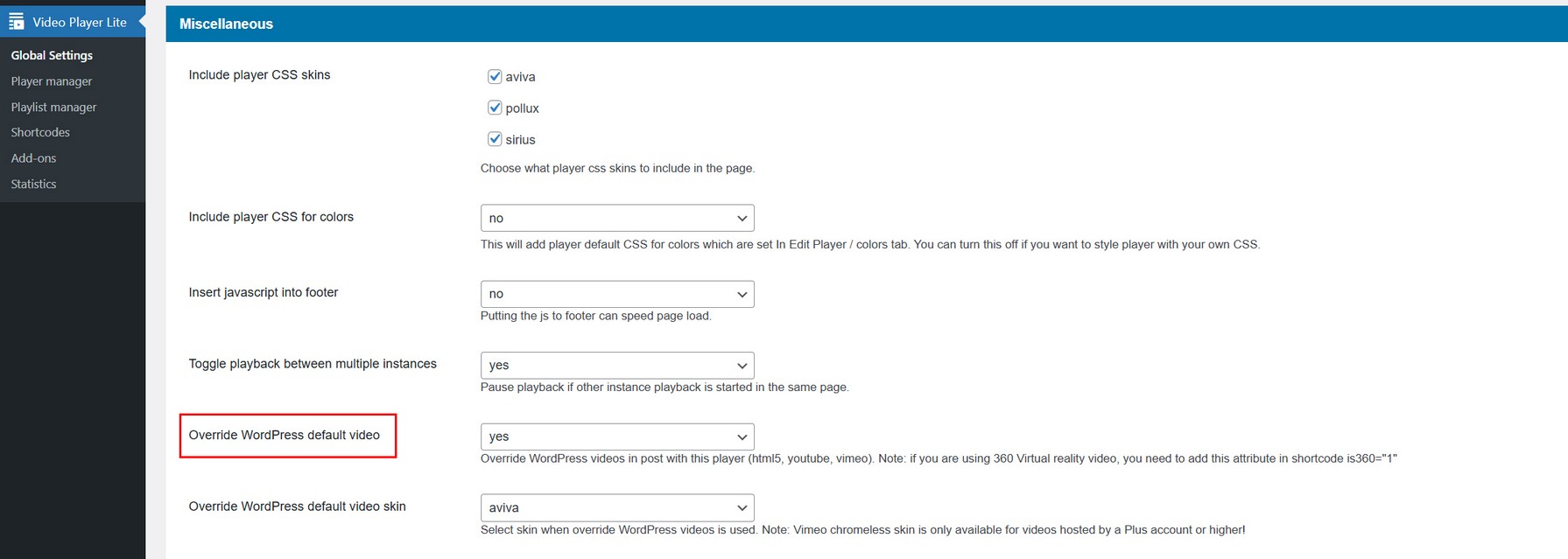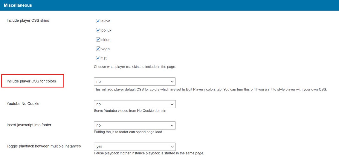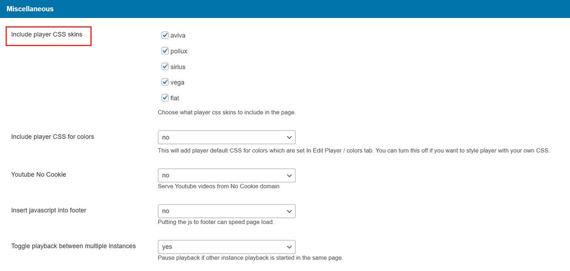 Each player skin comes with its own CSS file. You can choose which CSS files to include in the page in Global settings: