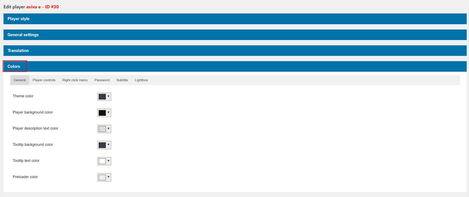 You can change player colors in Edit Player / colors tab. This will include dynamic css for player colors.