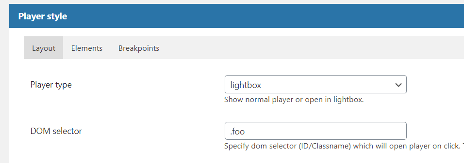 [apvpl type="video" path="PATH_TO_MP4_VIDEO" description="DESCRIPTION_HERE" player_type="lightbox" selector_init=".foo"] <a href="#" class="foo">open lightbox</a>