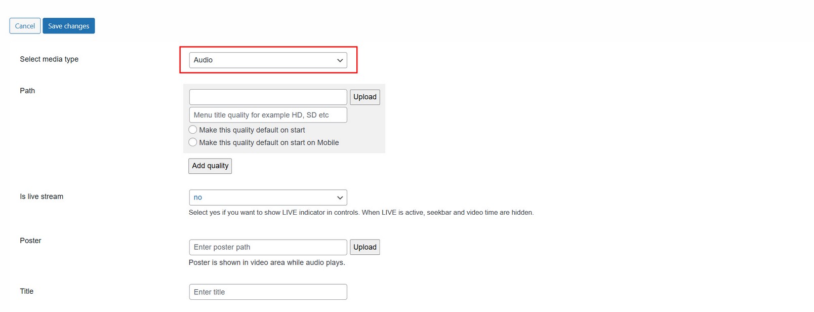 To add Self hosted audio to Player, in Edit Playlist choose Add media, and choose Audio type: