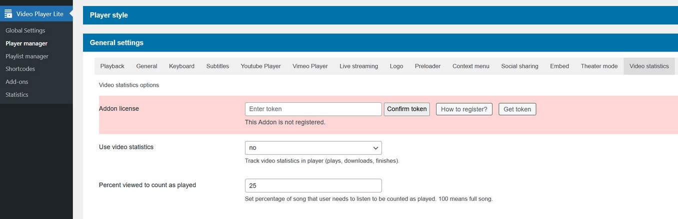 Register plugin inside Player manager / Edit player / General / Video Statistics tab