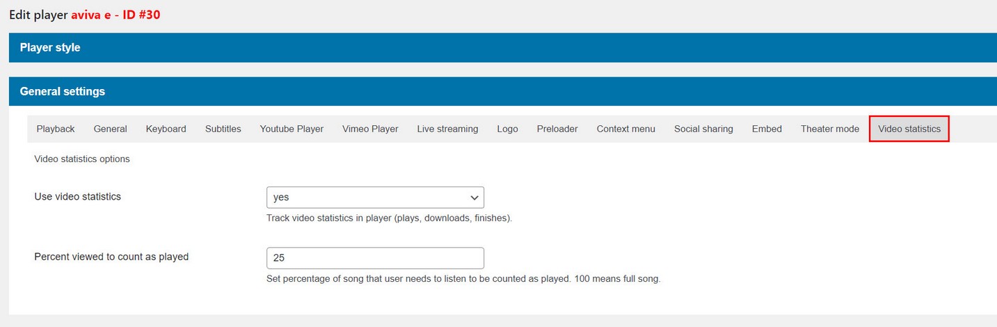 Access Statistics settings in Player Manager / Edit Player / Video Statistics tab.