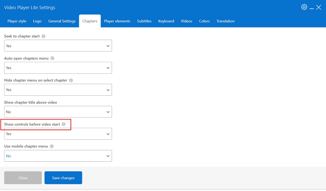 1. If you want to show chapter menu before video starts, select Show controls before video is played in Chapters tab: