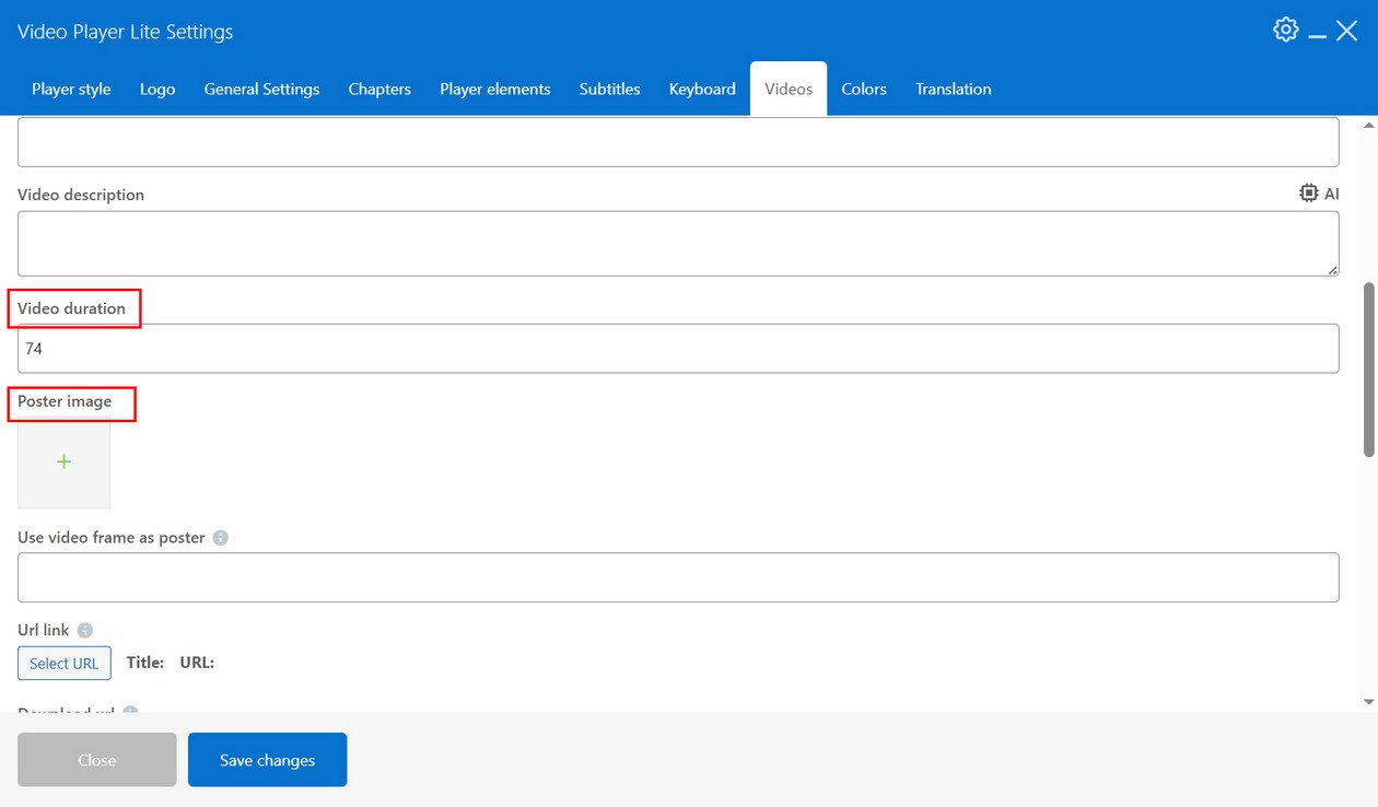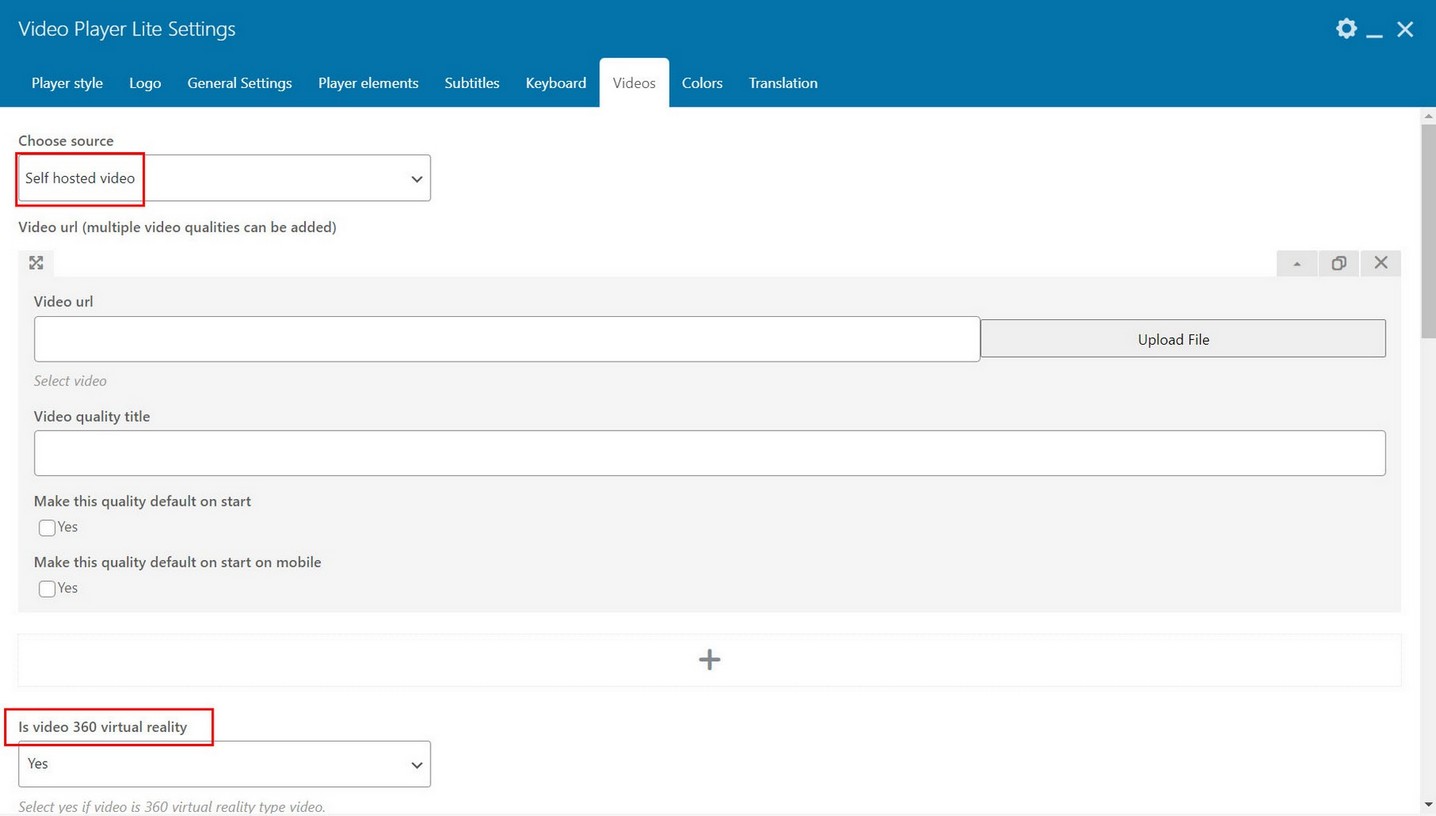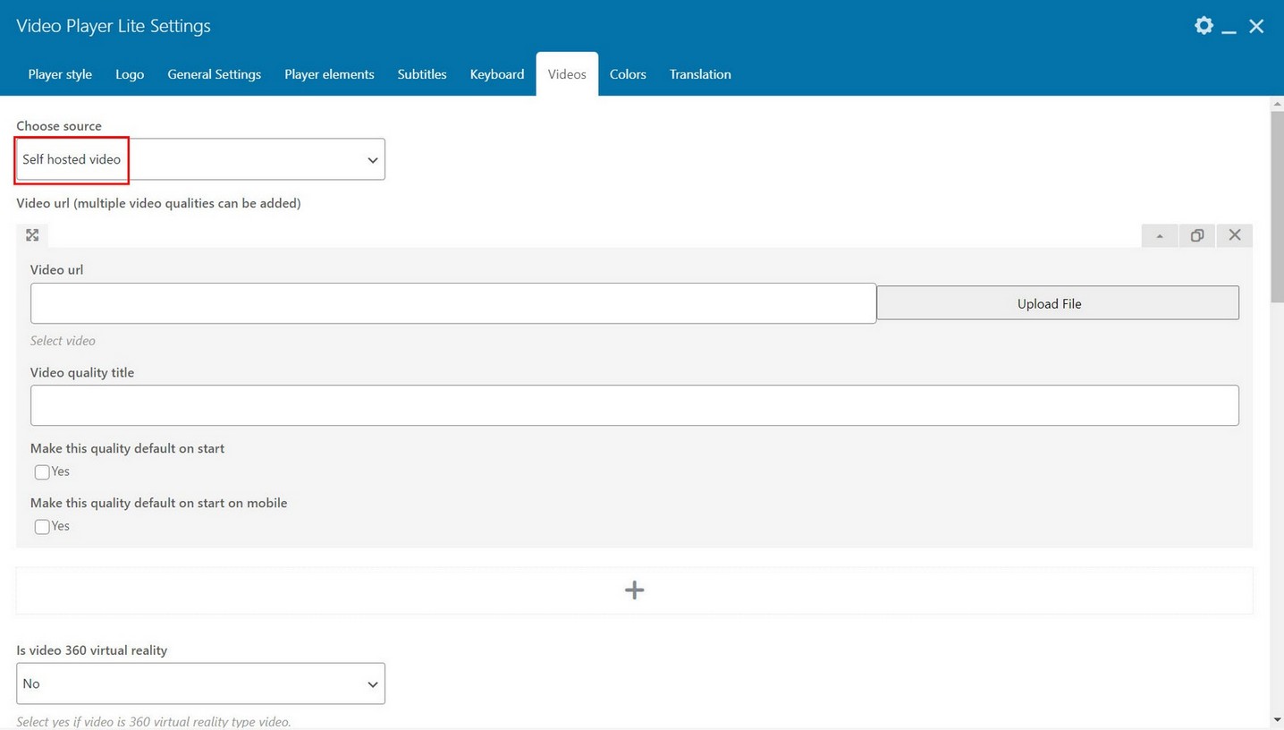 Provide video url (mp4 format is supported on all browsers and its recommended format) and Video quality title which is shown in video quality menu. (if you have only single video quality this quality menu is automatically hidden).