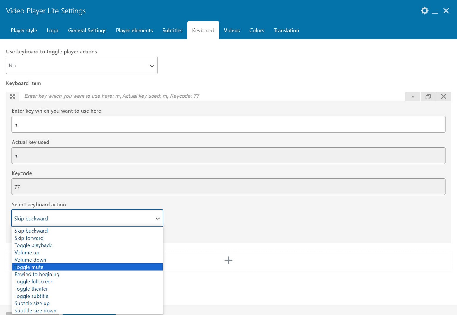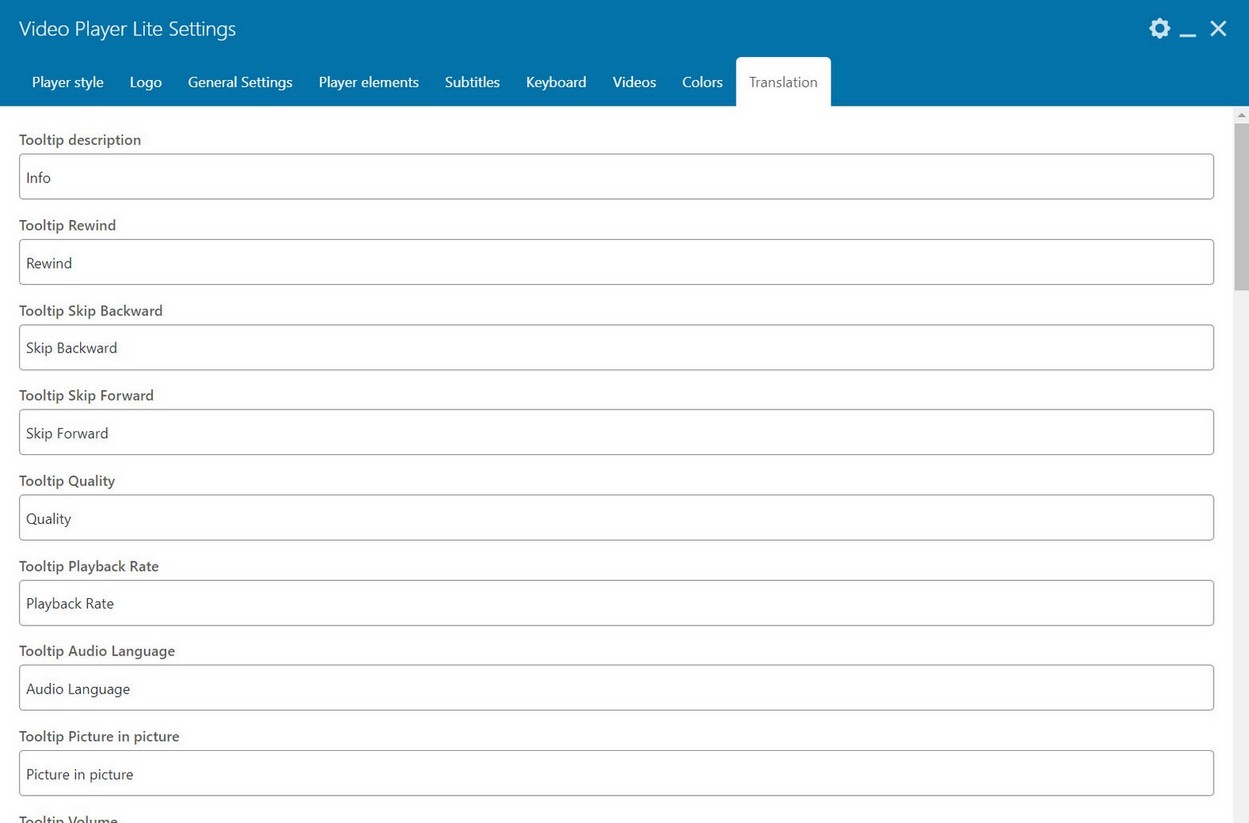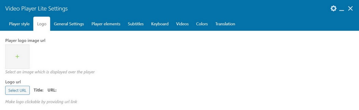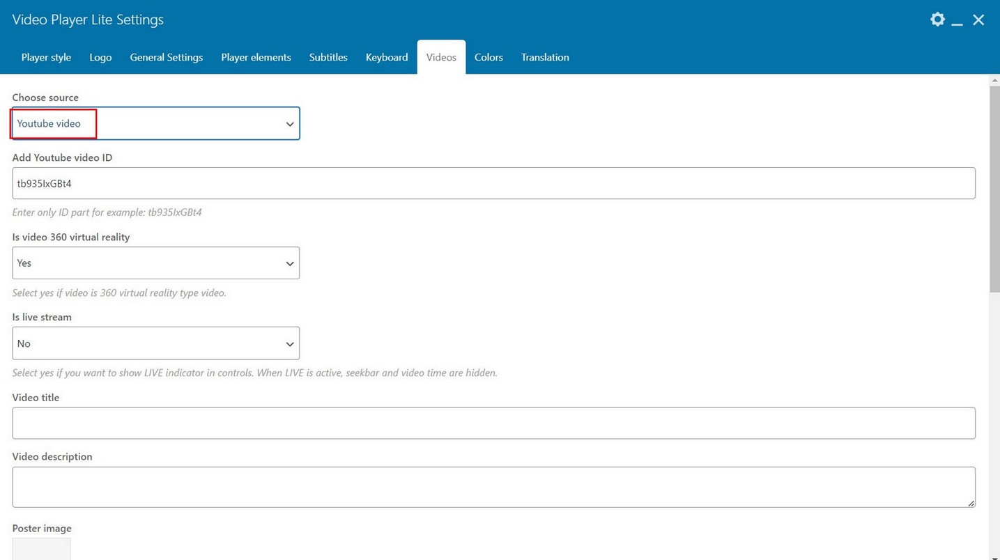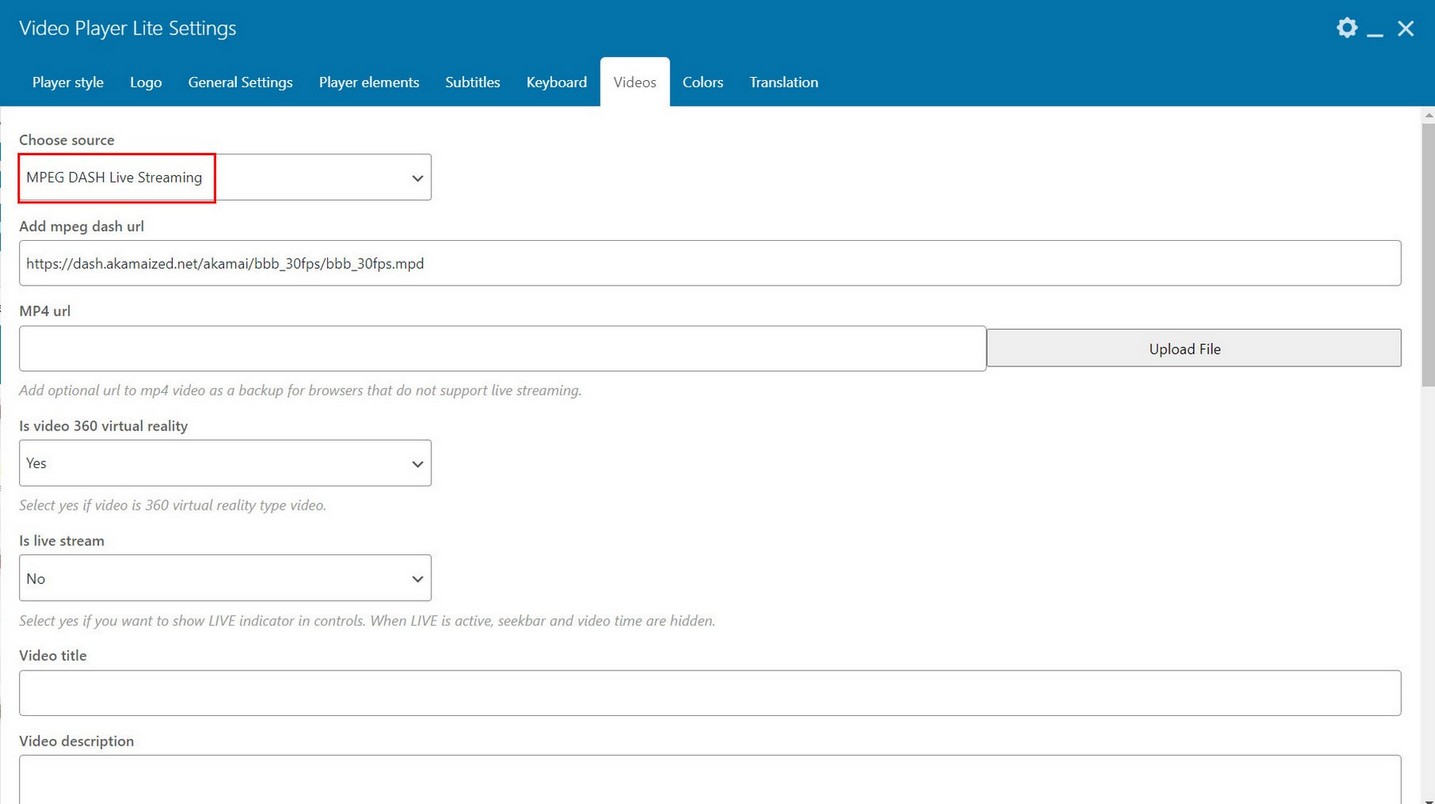 Videos are added to player in Videos tab. Player can show HTML5 videos, Youtube and Vimeo single videos, Apple HLS live streaming or MPEG-DASH live streaming, audio url and image.