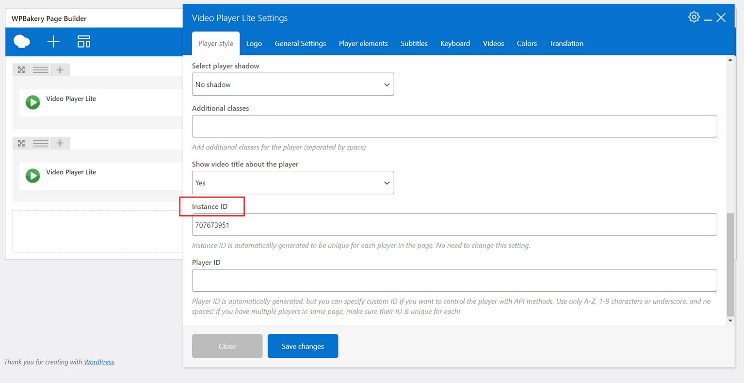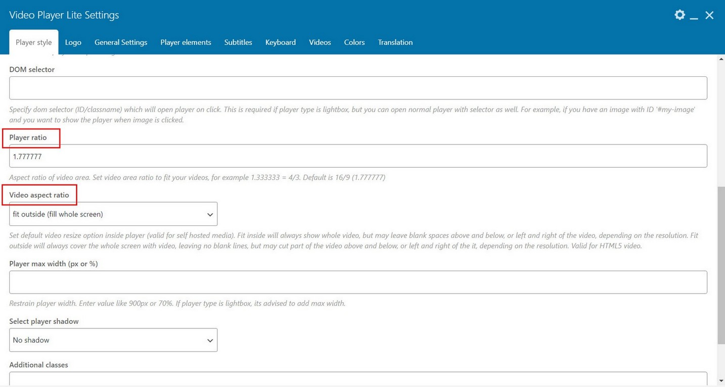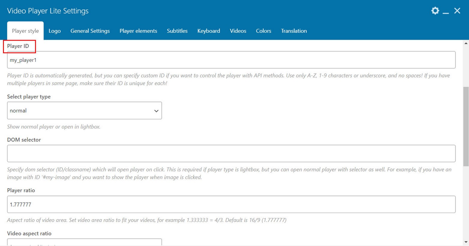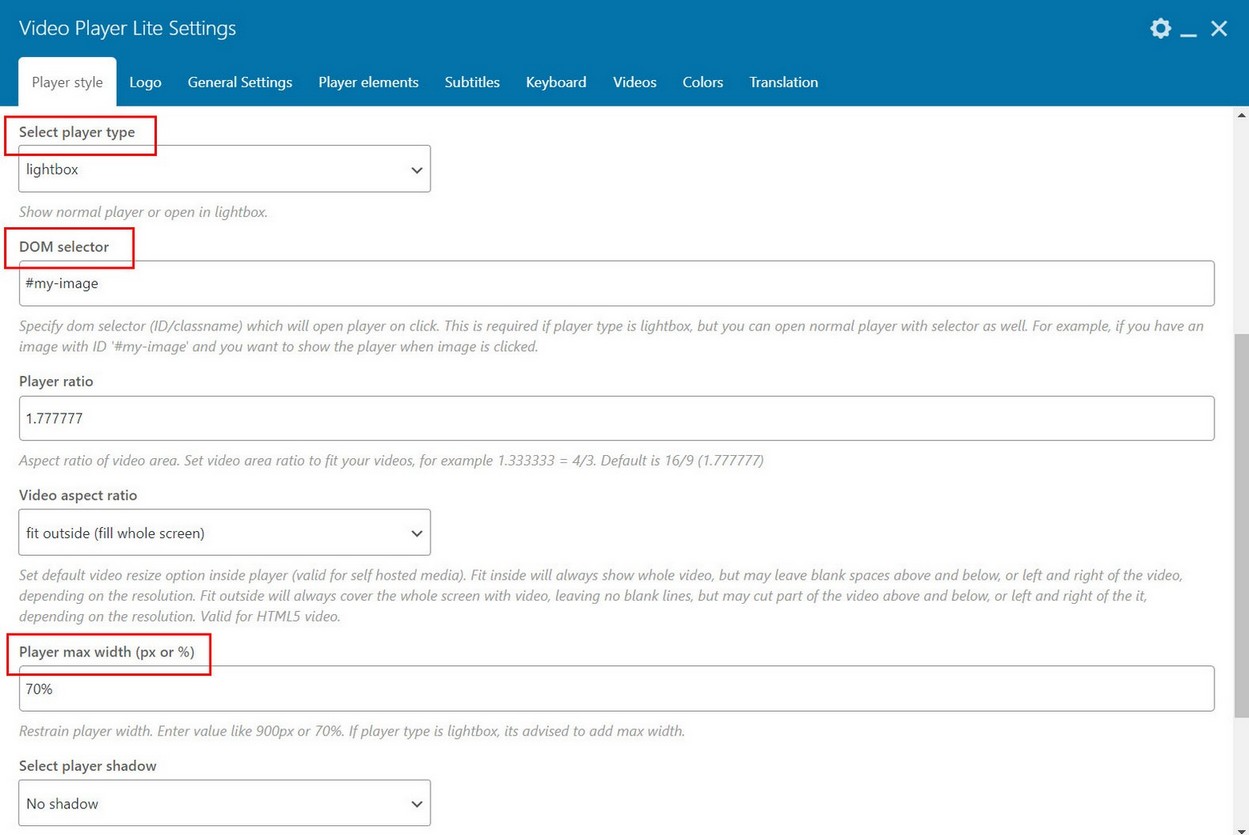 3. Choose player type lightbox. Add this ID attribute as DOM selector. Its also advised to set player max width (we used 90% in this example). If player has no max width, then it will occupy whole page with and height. Also, button to close lightbox player will be located directly over the player area instead of aside.