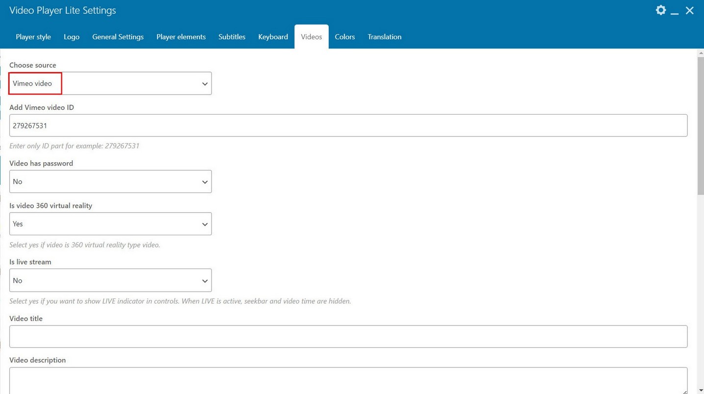 Player support Vimeo single videos. Enter only video ID part when adding Vimeo video!