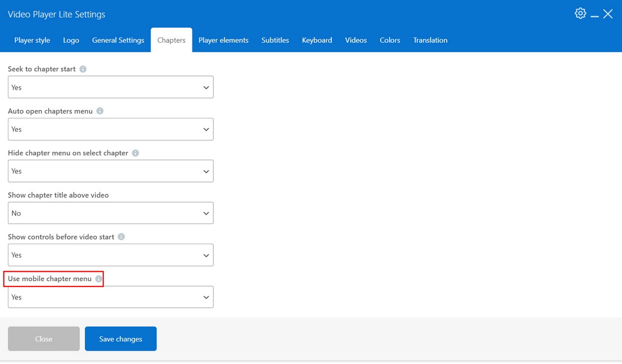 To display chapters in mobile friendy list, select Use mobile chapter menu in Chapters tab: