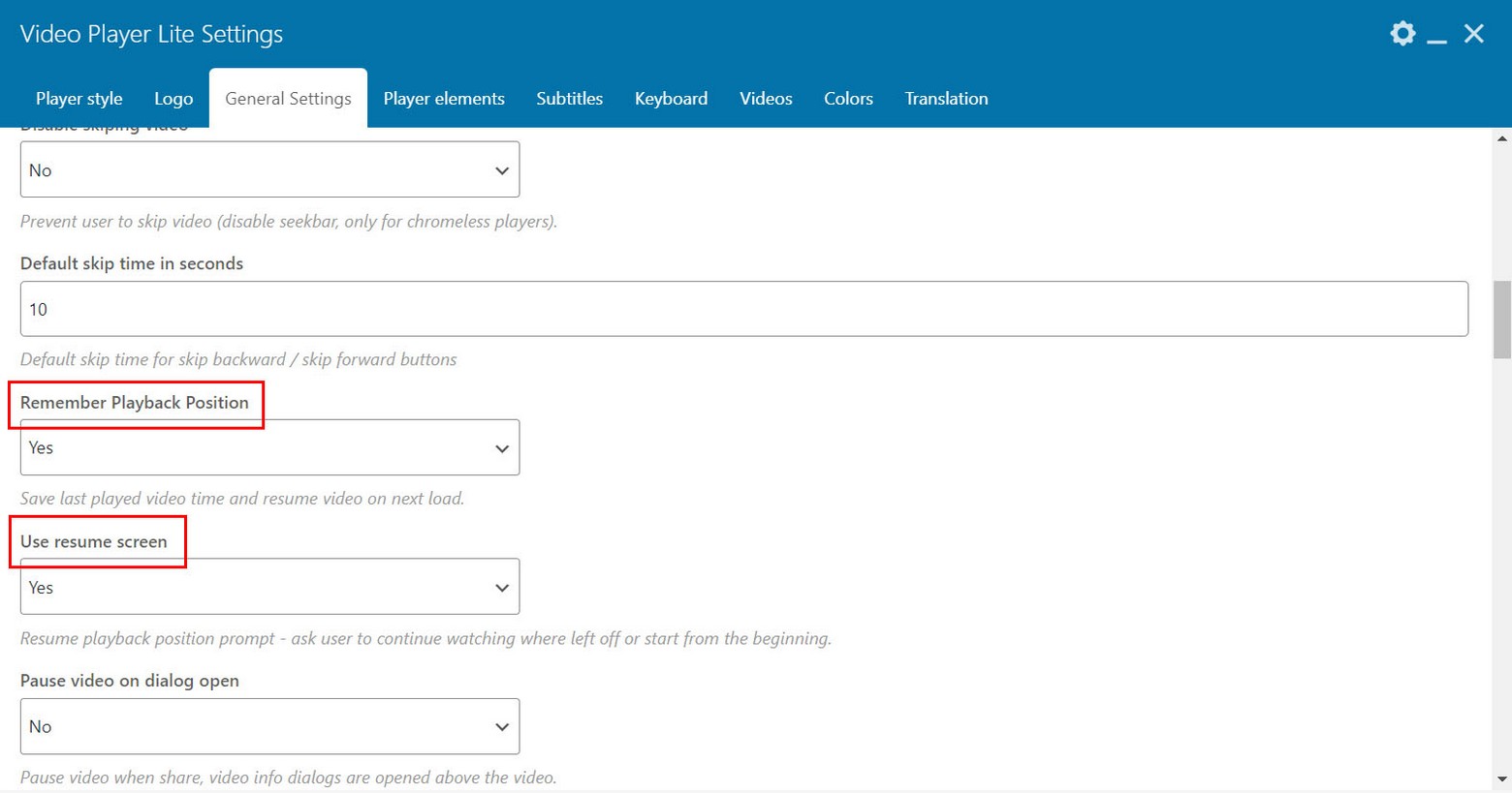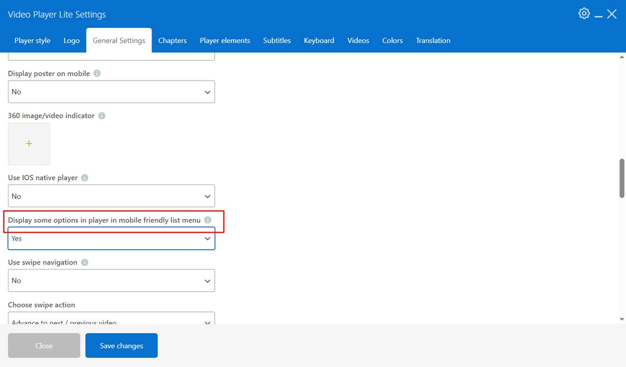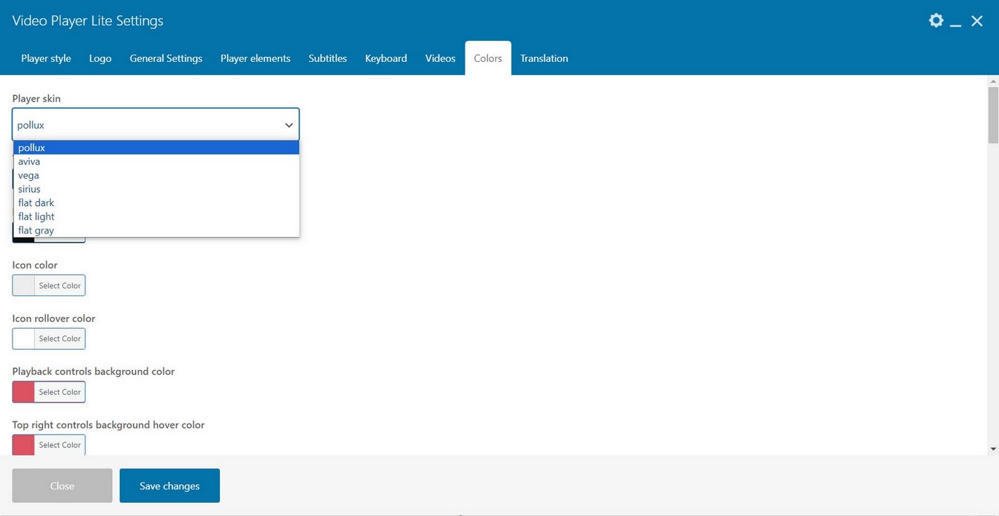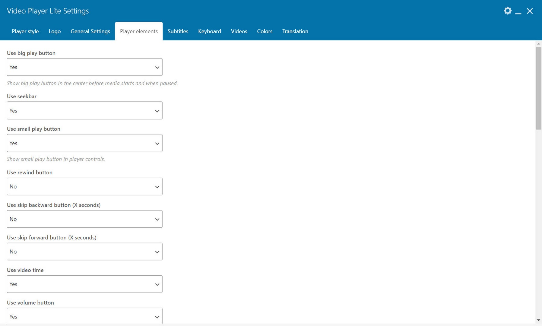 Inside Player elements tab you can choose what player features and buttons to use