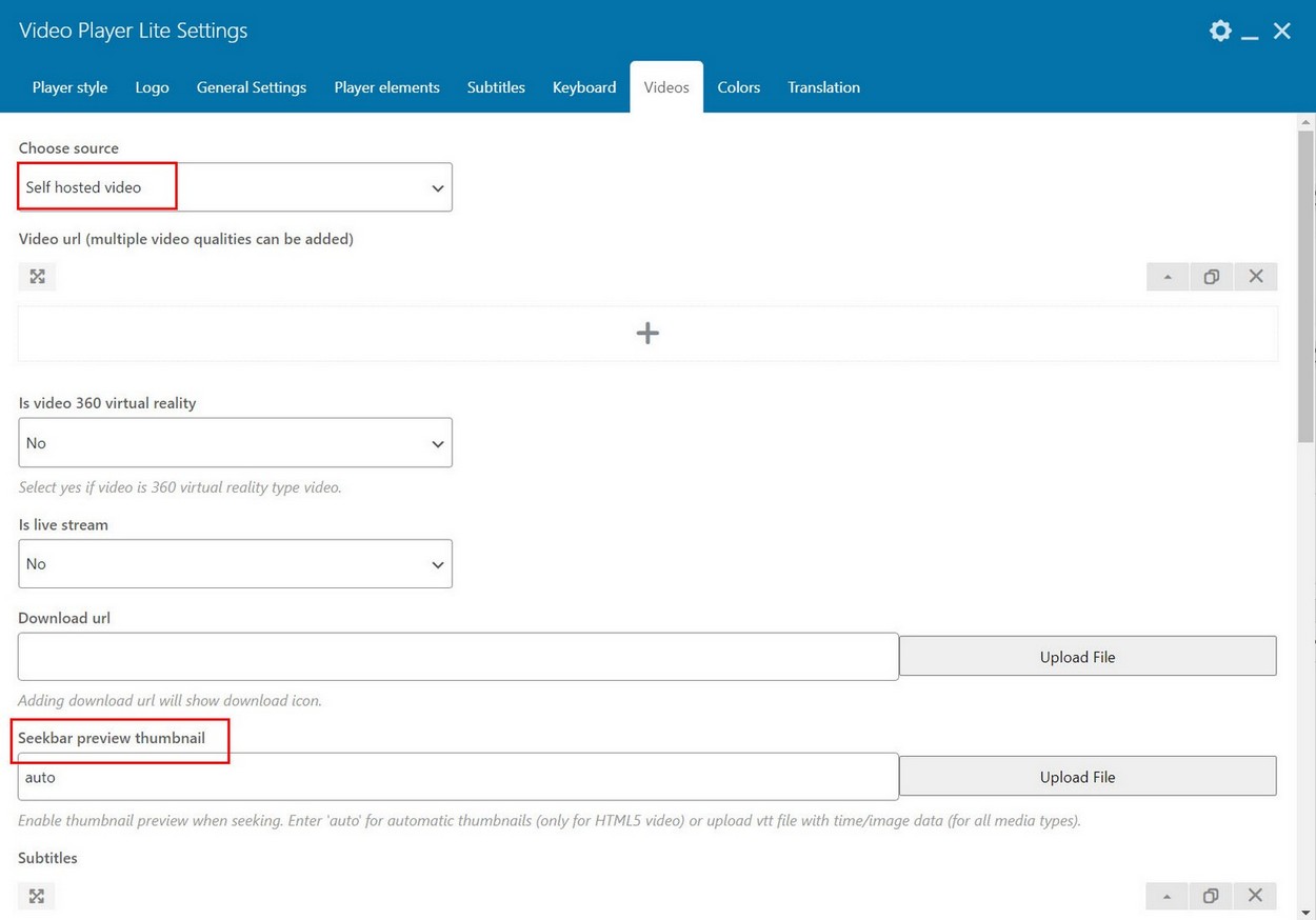 There are 2 ways of using this (use "auto" feature or provide vtt file). You can add preview thumbnails to video inside Video tab.