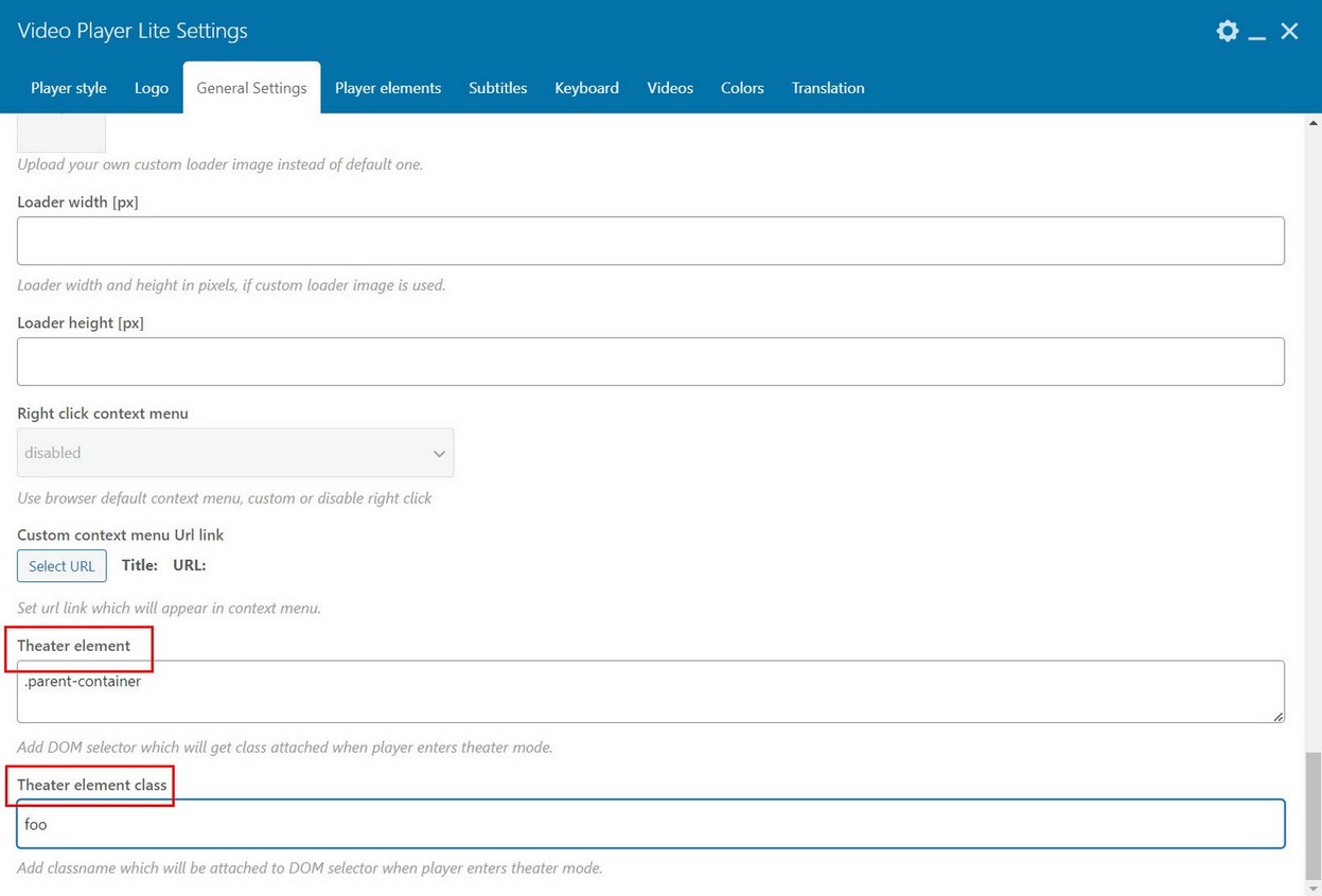 With following settings, when player enters theater mode, parent-contaner will get class "foo" attached, which makes parent container 100% width.