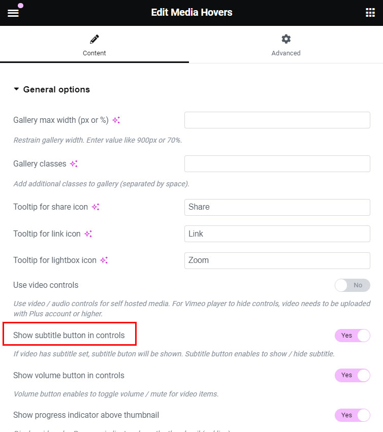 Add subtitle to item in Media tab, under Hover action, add or upload subtitle url: