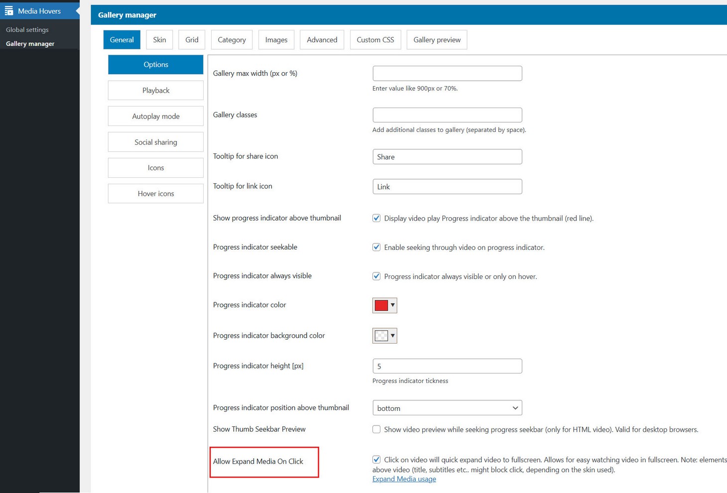 Depending on the skin you use, you might want to customise some features. Expand mode will ONLY be triggered if user clicks directly on image / video area (not on any buttons or other elements above the image)