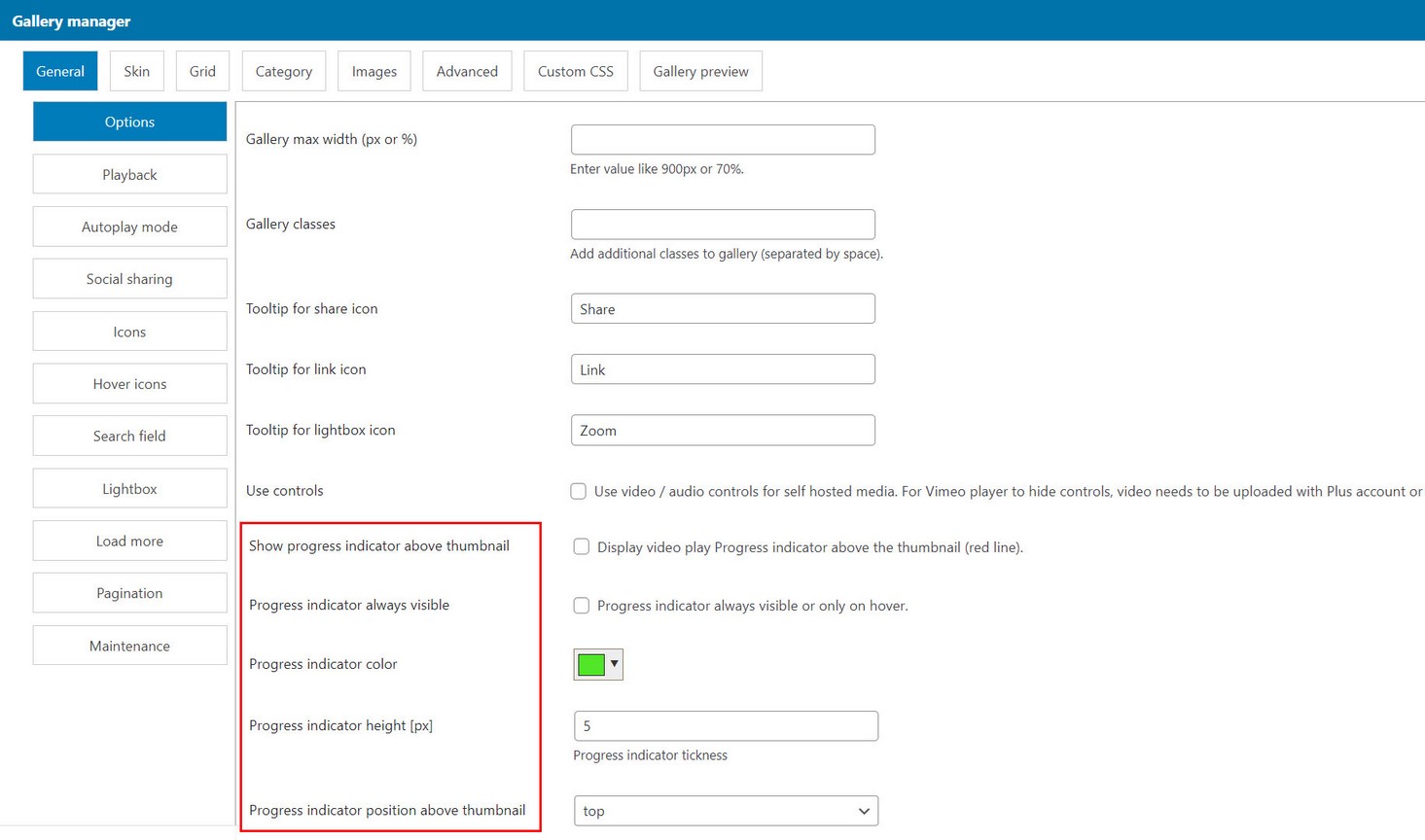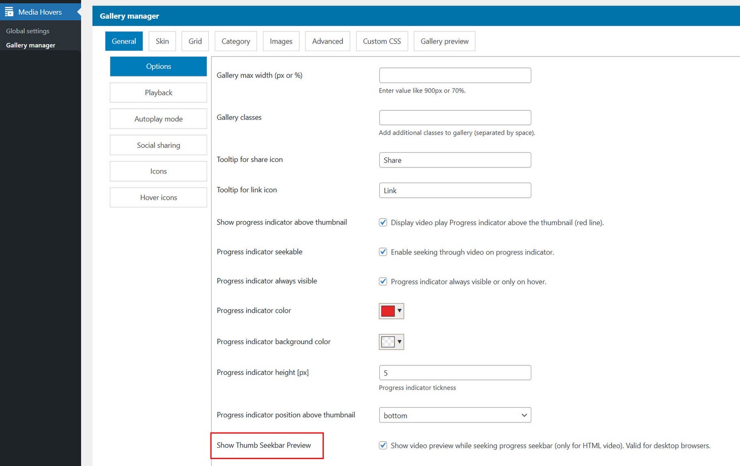 Enable preview seek thumbnail when seeking progress indicator in Gallery manager / Edit gallery / options tab