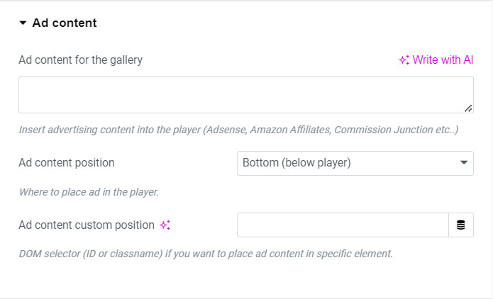 You can add ad content and choose position of the content inside the player. If you set custom position this will take precedence. Example of custom position ("#my-div", ".my-other-div")