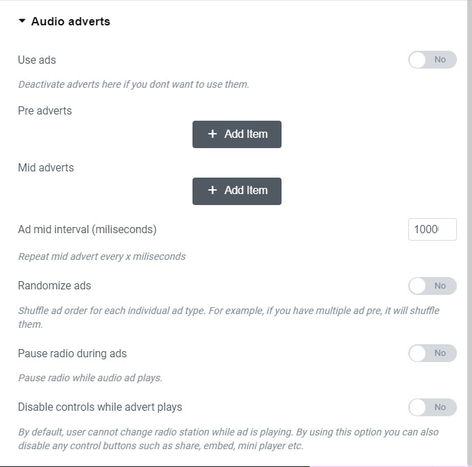 Audio adverts are defined in Audio adverts tab: