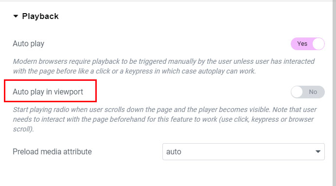 To make the player autoplay when user scroll the page and video player enters into view use the following settings in Edit Player / General / Playback tab: