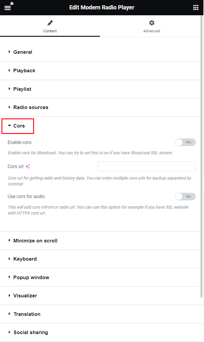 Cors is required to read some radio stations, including radio metadata and artwork. You can try if you radio works without CORS, but in many cases, CORS will be required.