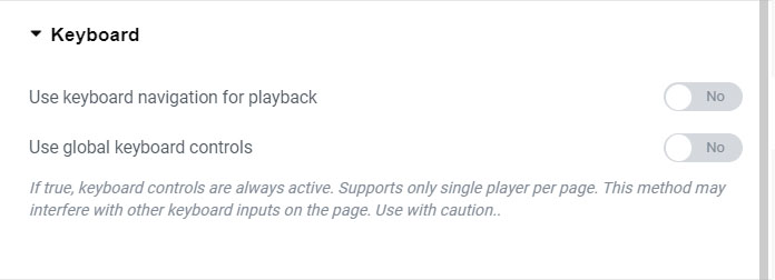Keyboard controls only work when mouse is over player area and player has focus! If you set Use global keyboard controls, then keyboard will work anywhere on the page.