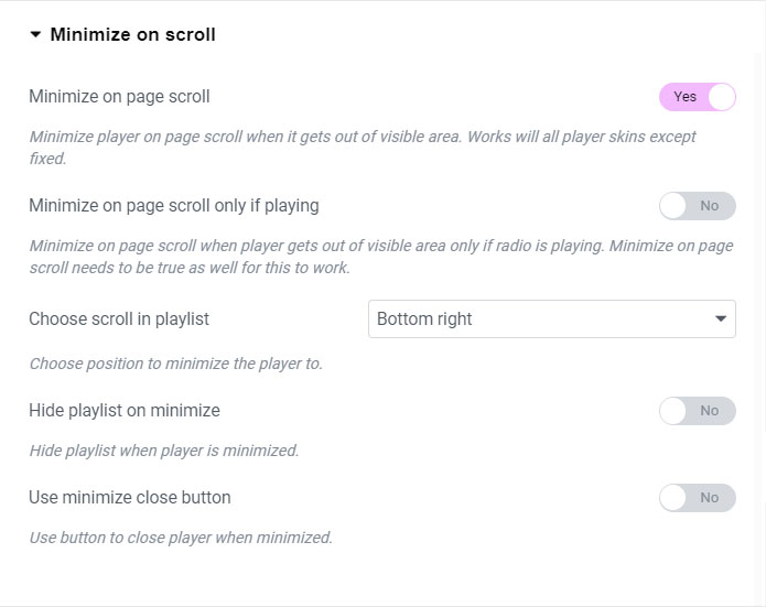 To make the player automatically become fixed to page bottom if user scrolls down the page, use the following settings in Minimize on Scroll tab: