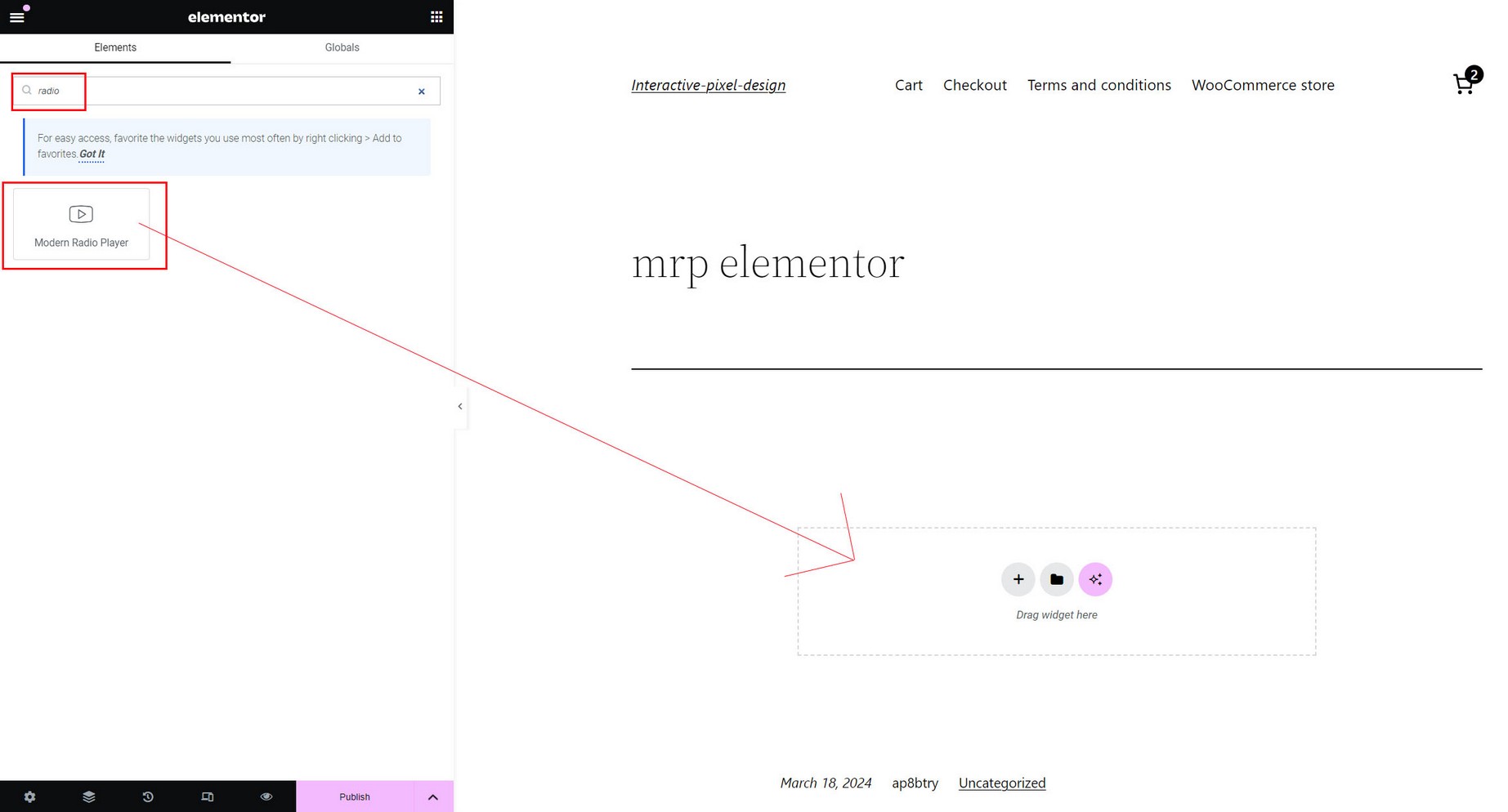 1. Search for Modern Radio Player in Elementor widgets: