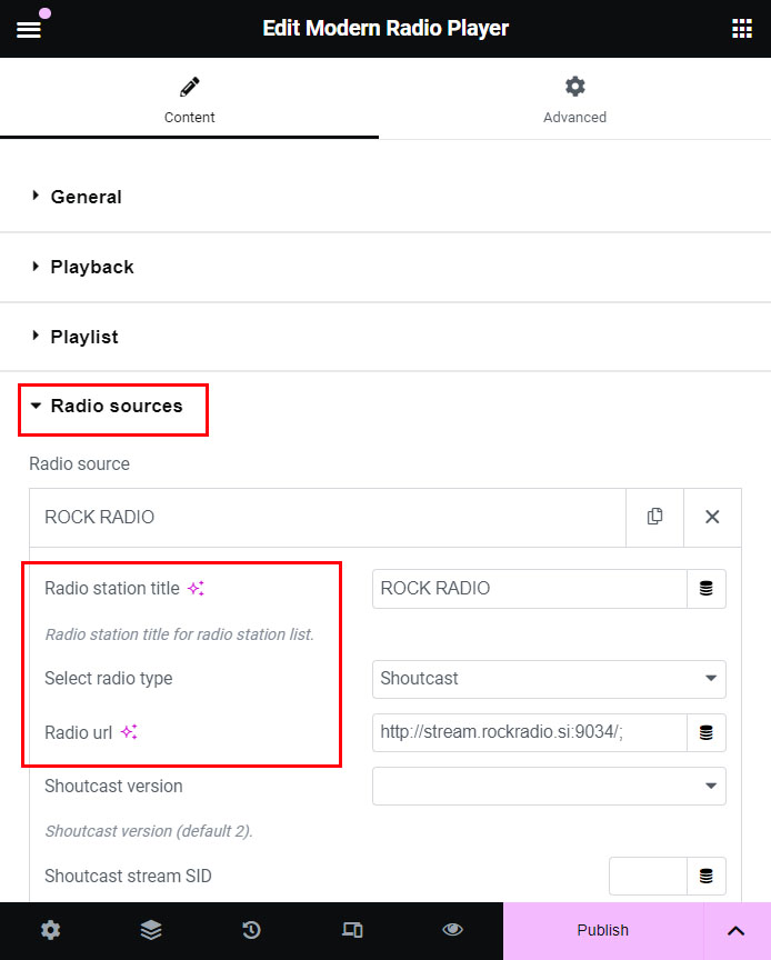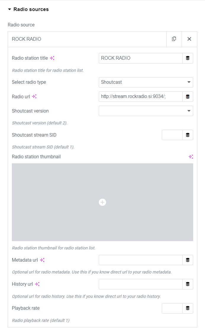 2. In Radio sources tab Add item, choose Radio type and add your radio url.