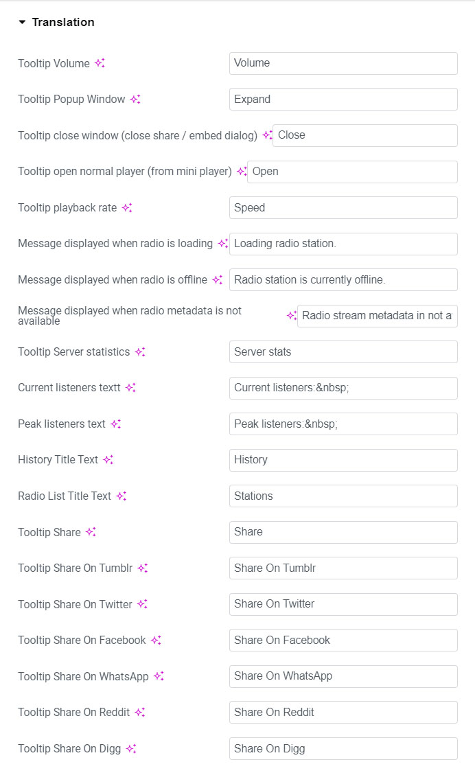 Other translate options are available in relevant tabs, like Social sharing or Youtube player custom skin tab.