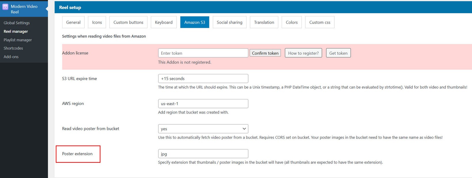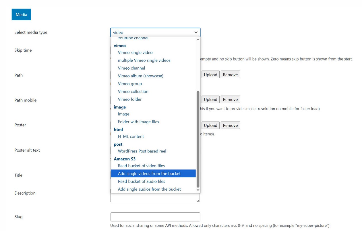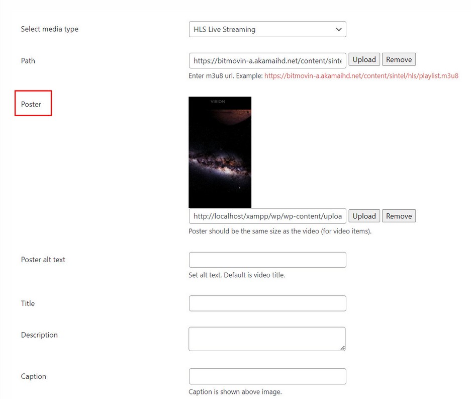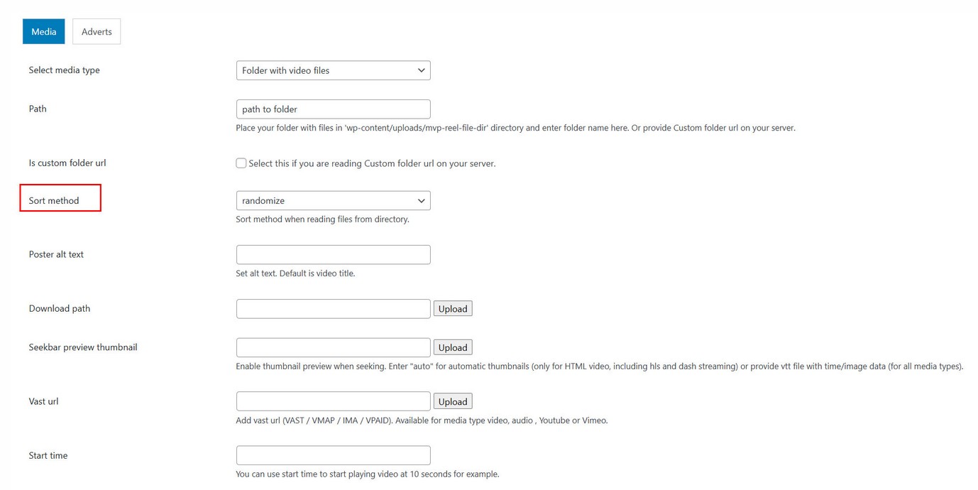 requirePosterFromFolder - true / false. When loading folder playlist, whether to get poster for each video. Requires poster image files present in folder directory for each video. Its recommended to use poster for reel items. getImageFromId3 - true / false. When loading folder playlist of audio files and reading ID3 tags, whether to get audio cover image for poster. Requires cover image set for audio files in ID3 metadata. Tends to slow down loading on start, especially if cover image is large in size. Better is to provide normal images instead and use Require Poster From Folder option above.