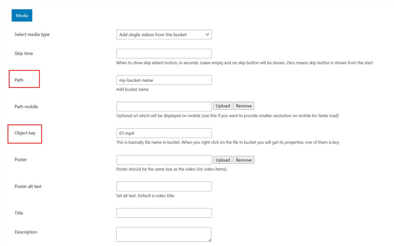 We have bucket (called "video" in our example, this can be called anyhow). Inside "video" folder are videos, poster, folder. "poster" folders are optional. Inside "poster" directory poster files are located.